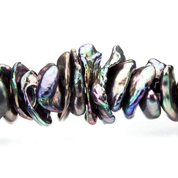 Peacock Keshi Freshwater Pearls have been center drilled for varied usage with an approximate average 3mm width. These freshwater pearls have a cornflake-like Keshi shape measuring approximately 6x5mm to 10x8mm in diameter. These multi-color iridescent orient peacock pearls are well matched on the strand for treated color, quality, luster, and shape.