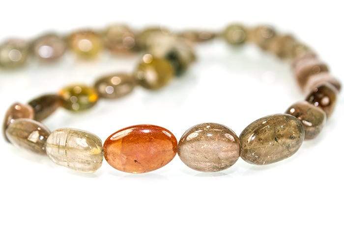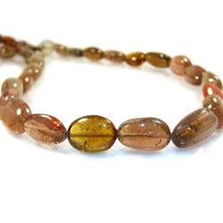 Multi-color Tourmaline Straight Drill Plain Nuggets measure approximately 6x6mm up to 12x8mm in size, have approximately 33 gems on the strand, the gems are brilliant, have a vitreous luster with a transparent body, the gems are medium avocado green, a light brownish green, an orangy brown, and a pinkish brown hue, gems have internal characteristics, the bead resembles a large size barley shape, the gems are very well matched on strand for a slightly brownish tone, and the strand is a wonderful value.