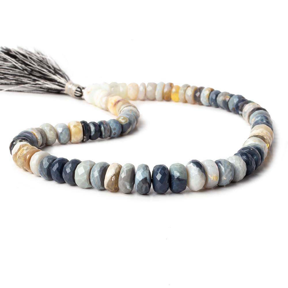 Cream, grey, blue Australian Opal faceted rondelles have a waxy luster with excellent faceting creating a symmetrical rondelle shape, show visible matrix, have fair play of color, and their body colors are a dark to a medium light saturation of beige & grey color. These Opal gems present with an opaque to translucent quality and are mined in Australia.