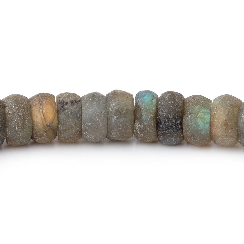 Matte Labradorite plain rondelle beads exhibit a frosted luster on the nicely made symmetrical beads showing good color flash within the gray bodies that match throughout the strand.