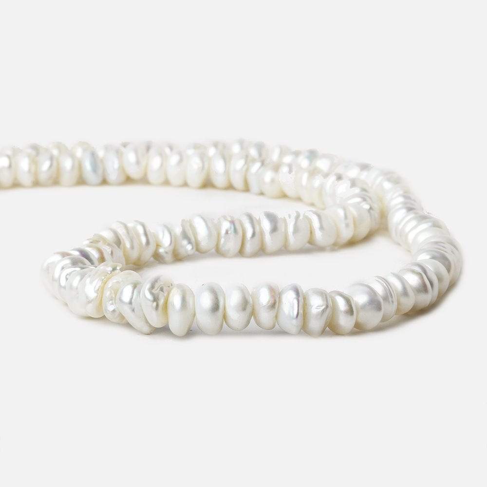 White Center Drilled Keshi Freshwater Pearls have fair luster, asymmetrical shapes, are matched on strand for color, luster varies from high to medium, and are a great size for a center drilled Keshi pearl strand.