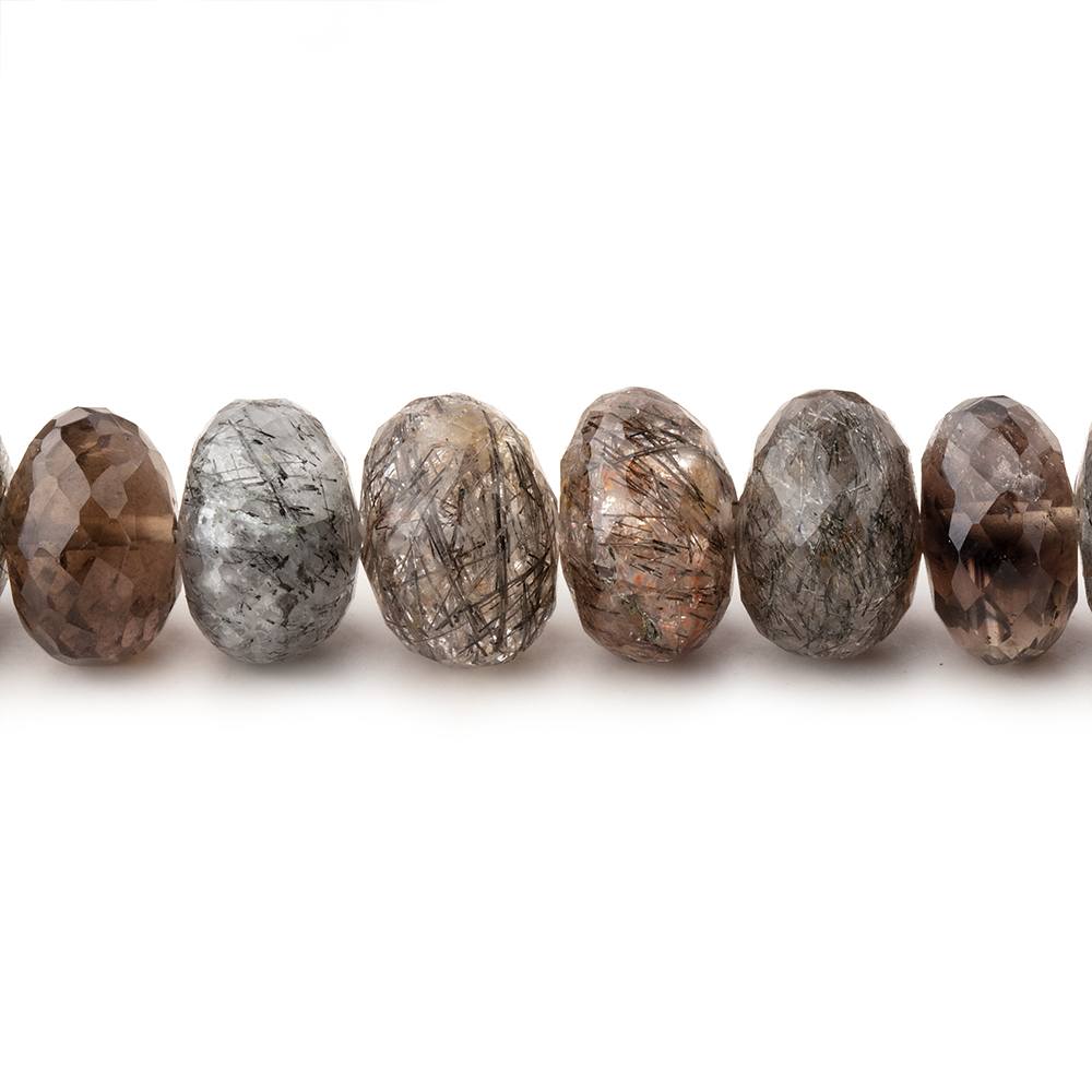 Tourmalinated Quartz and Smoky Quartz Faceted Rondelles measure approximately 6mm to 8mm in diameter size, have a glass like luster, good polish, the shapes are symmetrical with various degrees of black tourmaline needles throughout, and the translucent colorless crystal quartz to Smoky quartz bodies are a great value with strong aspects of thick to fine black tourmaline needles throughout the strand.
