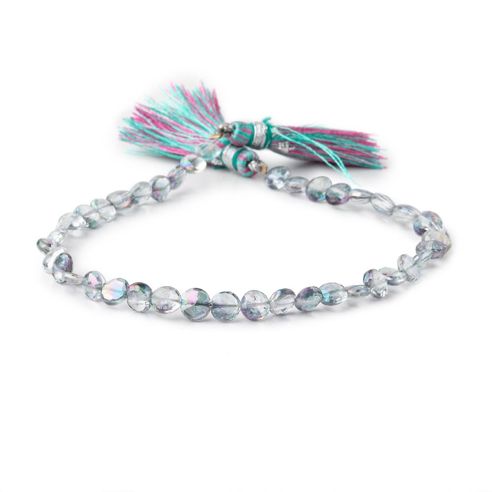 Aurora Borealis or Mystic Grey Topaz faceted Coin beads measure approximately 5mm in size, the gems have a metallic coating providing an oil in water iridescent effect on this extremely brilliant gem body, the gems are transparent with a purple-blue-mint hue, and the gems are a highly refractive with excellent make, great heft, and rich color.