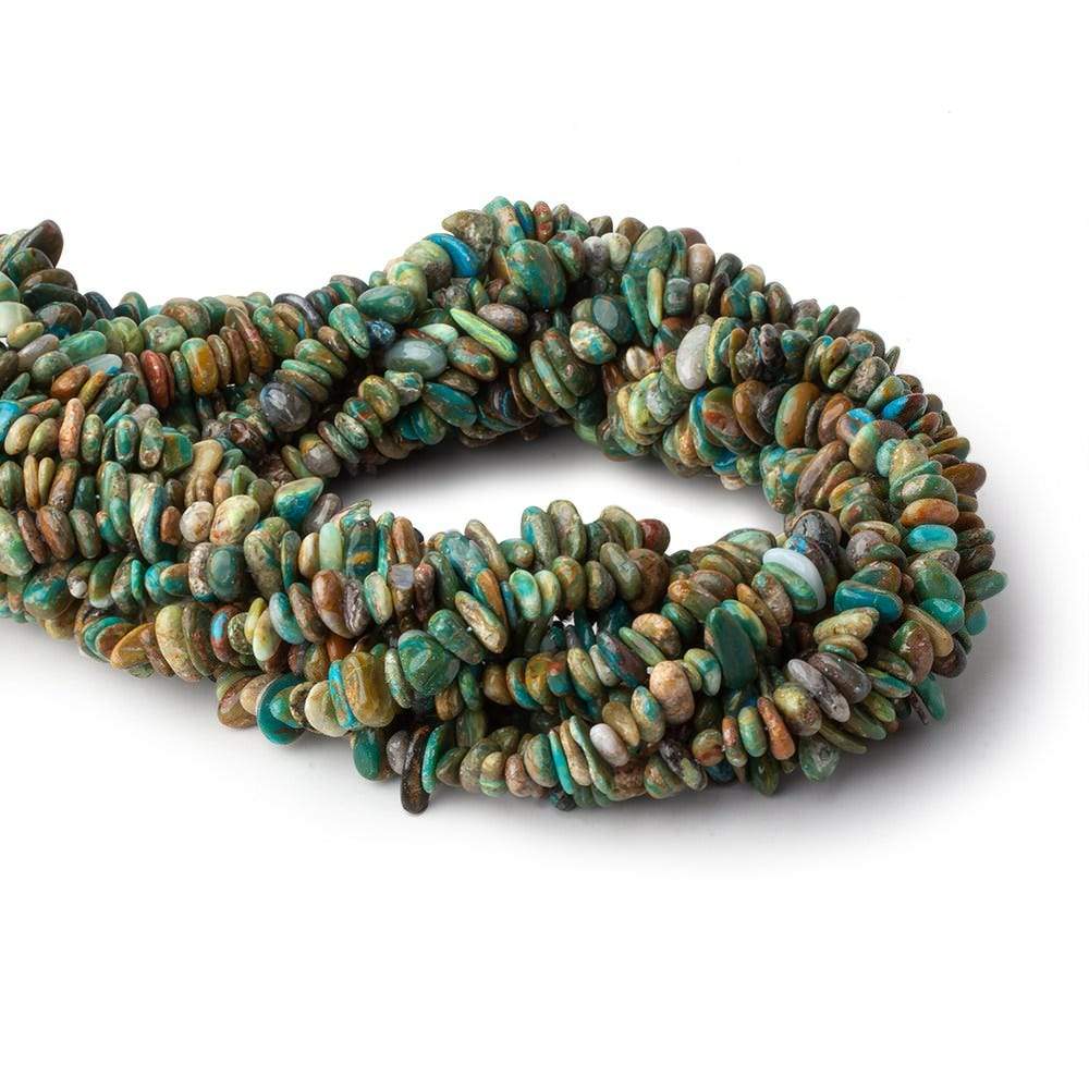 Peruvian Opal & Matrix plain chip beads have a widely varied size range & varied widths, gems have a waxy opal luster with a smooth appearance, and present as moderately light to lightly saturated turquoise-like blue hues and tan brown hues. A grade
