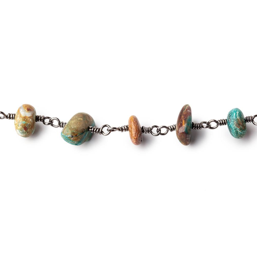 Blue Peruvian Opalina & Matrix plain chip nugget beads on Black Gold Over .925 Chain by the Foot with approximately 30 Beads per foot.