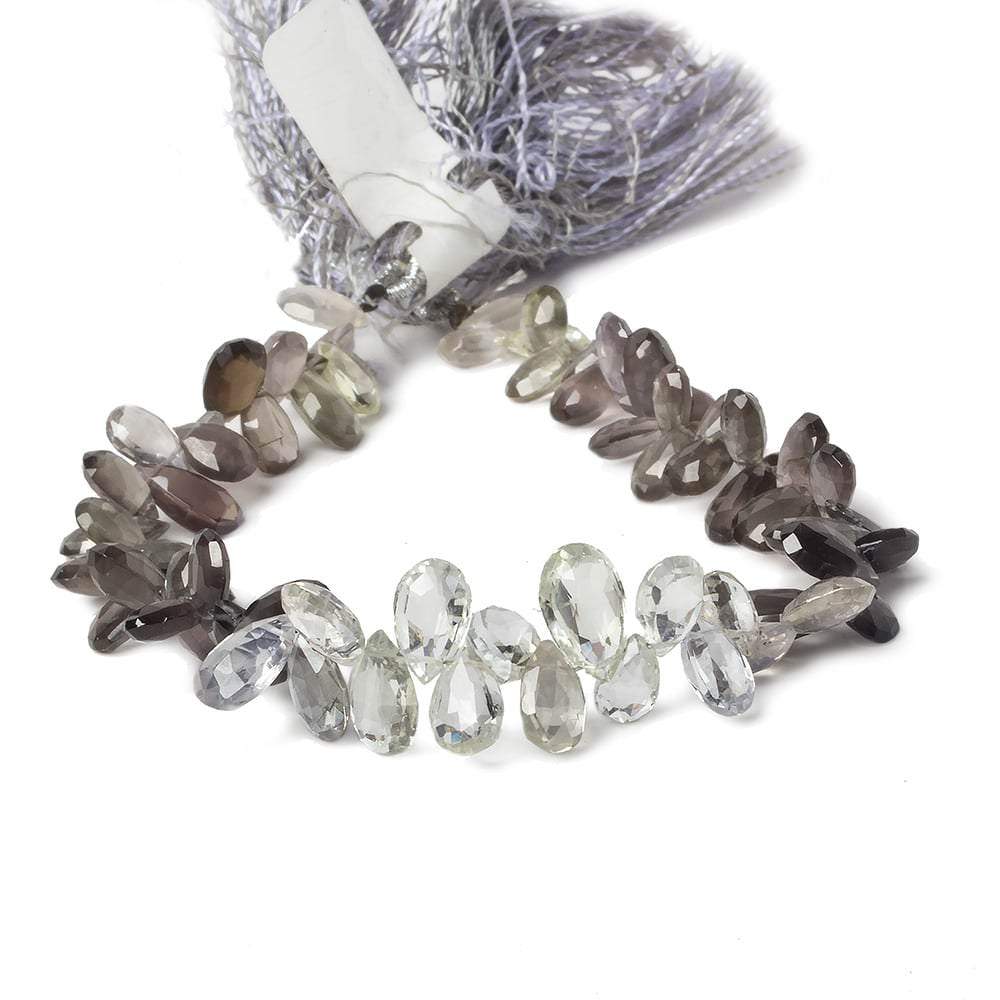 Multi-tonal Silimanite pear briolettes measure approximately 7x4mm to 11x7mm, exhibit glass like luster, excellent brilliance, excellent make, well matched bodycolors on the strand, and few eye visible inclusions.