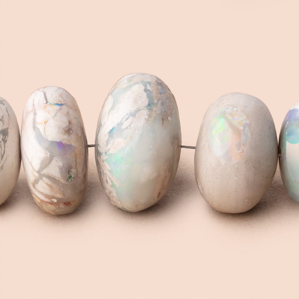 Australian Opal Plain Rondelle Beads have an symmetrical shape showing opaque to translucent areas with vibrant Play of Color and an organic appearance due to areas of matrix which add soft creamy beige hues. Larger than average size having a waxy luster on the polished body with a few areas of pitting due to natural surface irregularities. AA Quality