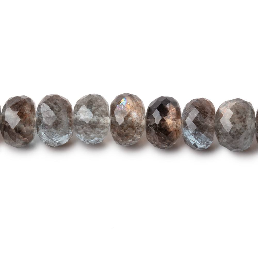 Moss Aquamarine Faceted Rondelle Beads with amazing copper schiller measure approximately 7mm to 7.5mm in size, gems have a vitreous luster, exhibit excellent cut and polish, beads have a symmetrical rondelle shaped body showing internal characteristics including stunning copper schiller, these transparent Moss Aquamarine beads have unique mossy features within a pale aqua blue to dark teal and charcoal grey hues for a truly unique color palette of Moss Aquamarine gems with brilliant color and AAA Quality.