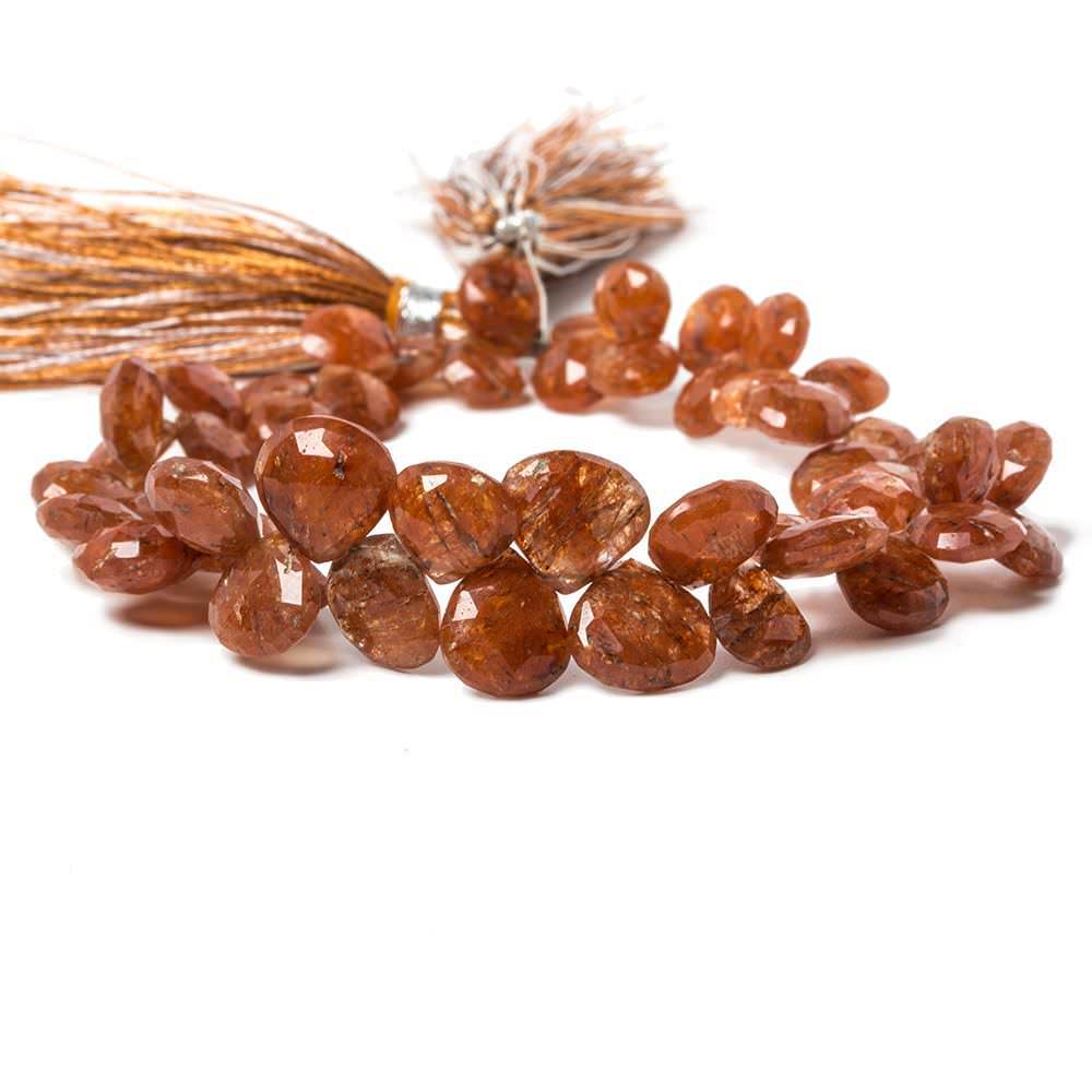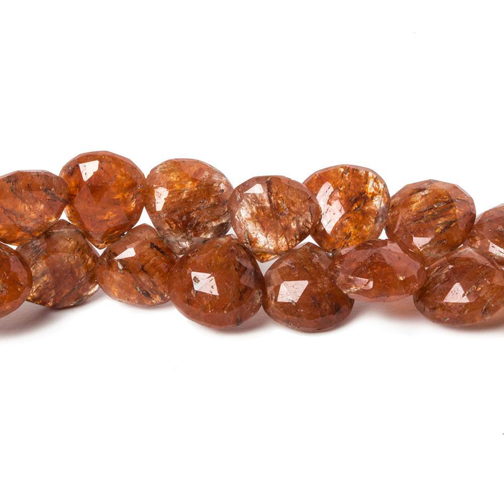 Mossy Rutilated Quartz Faceted Hearts measure approximately 7x7mm up to 8x8mm size, the opaque stones have a glass like luster, show symmetrical heart shapes, have good polish and faceting, the stones are well matched for hue on strand, beads appear as semi-tanslucent due to the generous rutile throughout, and the dark orangy-reddish brown gems have rutile needles that provide a metallic glint.