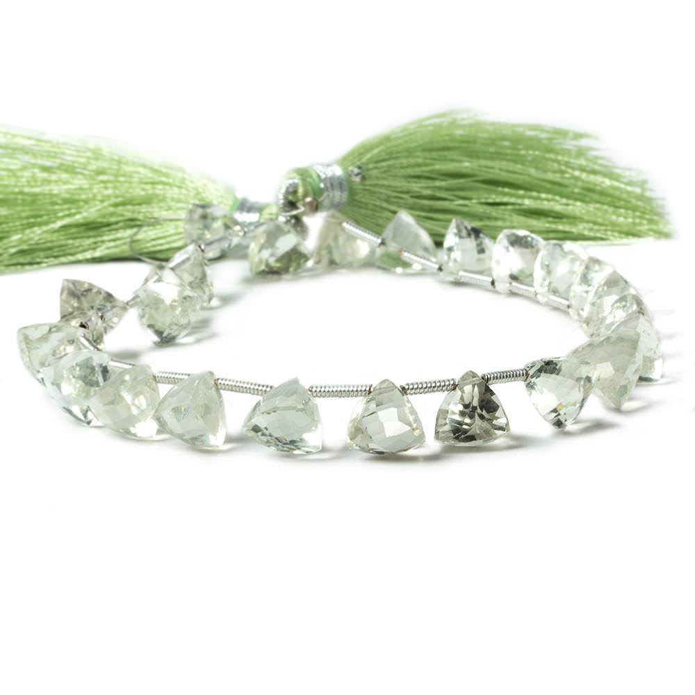 Prasiolite Top Drilled Trillions measure approximately 7x7mm up to 8x8mm in size, show a vitreous in luster, Prasiolite beads have an excellent polish and excellent faceting, exhibit a symmetrical trillion shape that is top drilled for a full bodied appearance, gems are a transparent, and these Prasiolite gemstones show a slightly yellowish mint green hue with minimal internal characteristics.