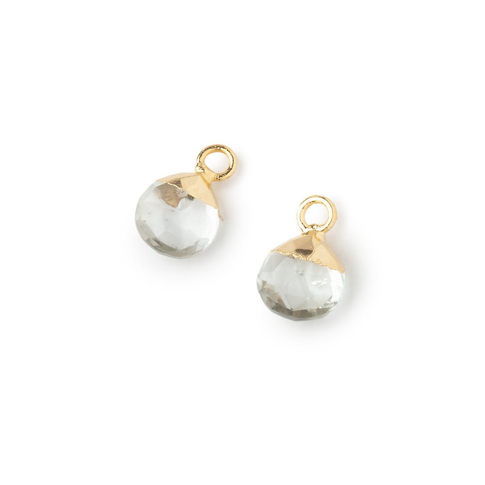 22kt Gold Leafed Prasiolite faceted hearts measure an average of 7x7mm with a 3mm ring and 22kt gold leafing at the tip. Sold as a set of 2 focal pieces that are closely matched and may not be an exact match.