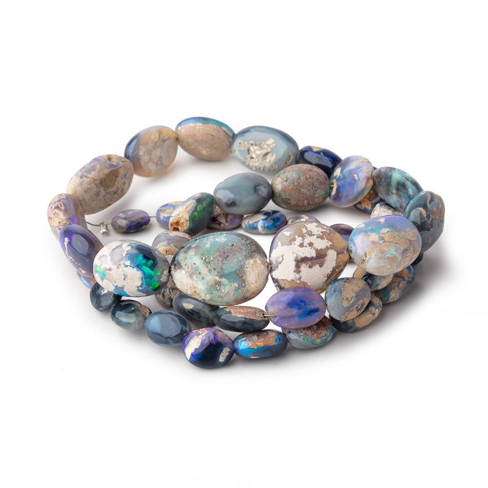 Australian opal Plain Nugget Beads have an asymmetrical shape showing opaque to translucent areas of blue-grey opals with vibrant Play of Color and an organic appearance due to areas of matrix which add soft creamy beige hues. A spectacular grouping that have polished bodies with areas of pitting due to surface irregualarities of the natural Opal beads.
