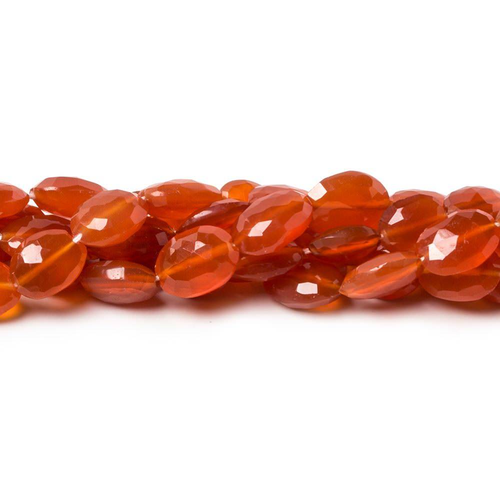 Dark Orange Carnelian Straight drilled ovals measure approximately 7x5mm up to 9x6mm in size, exhibit waxy luster, excellent cut and polish, good brilliance with very very slight internal characteristics on the well matched strand.