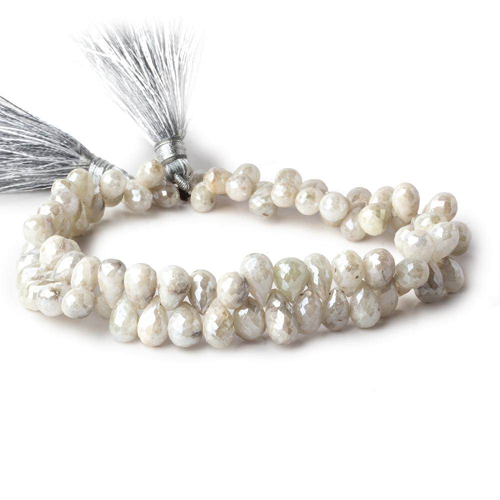 Silverite Sapphire has a silver titanium coating on a White Sapphire body providing for the well-known mystic look with great sparkle. These Mystic White Sapphire teardrops have an opaque transparency with an off white hue showing metallic luster, a consistent appearance throughout the strand, and are well made beads with symmetrical shaped bodies.