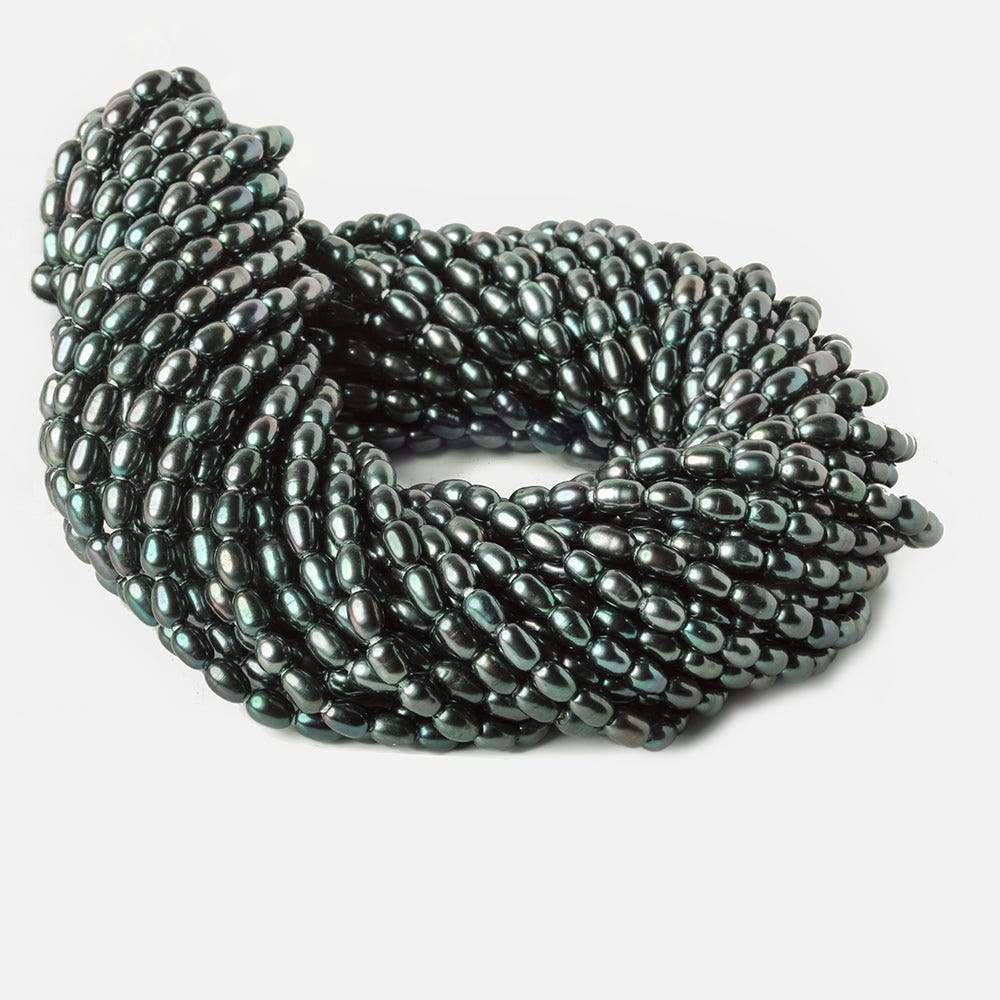 Large Hole Straight Drilled Oval Freshwater Pearls have excellent high luster, pearls have excellent nacre, are well matched for quality on strand, are straight drilled with a 1.5mm hole, and are an excellent value for an average size & well made freshwater pearl oval shape. The pearl has a deep platinum base with a strong iridescent peacock overtone. Large Hole pearls have a 1.5mm inside diameter. The drill holes are produced with a 5 step drill process to insure a cleanly drilled hole without abrasion to the nacre and the drill hole is a consistent diameter through the pearl.