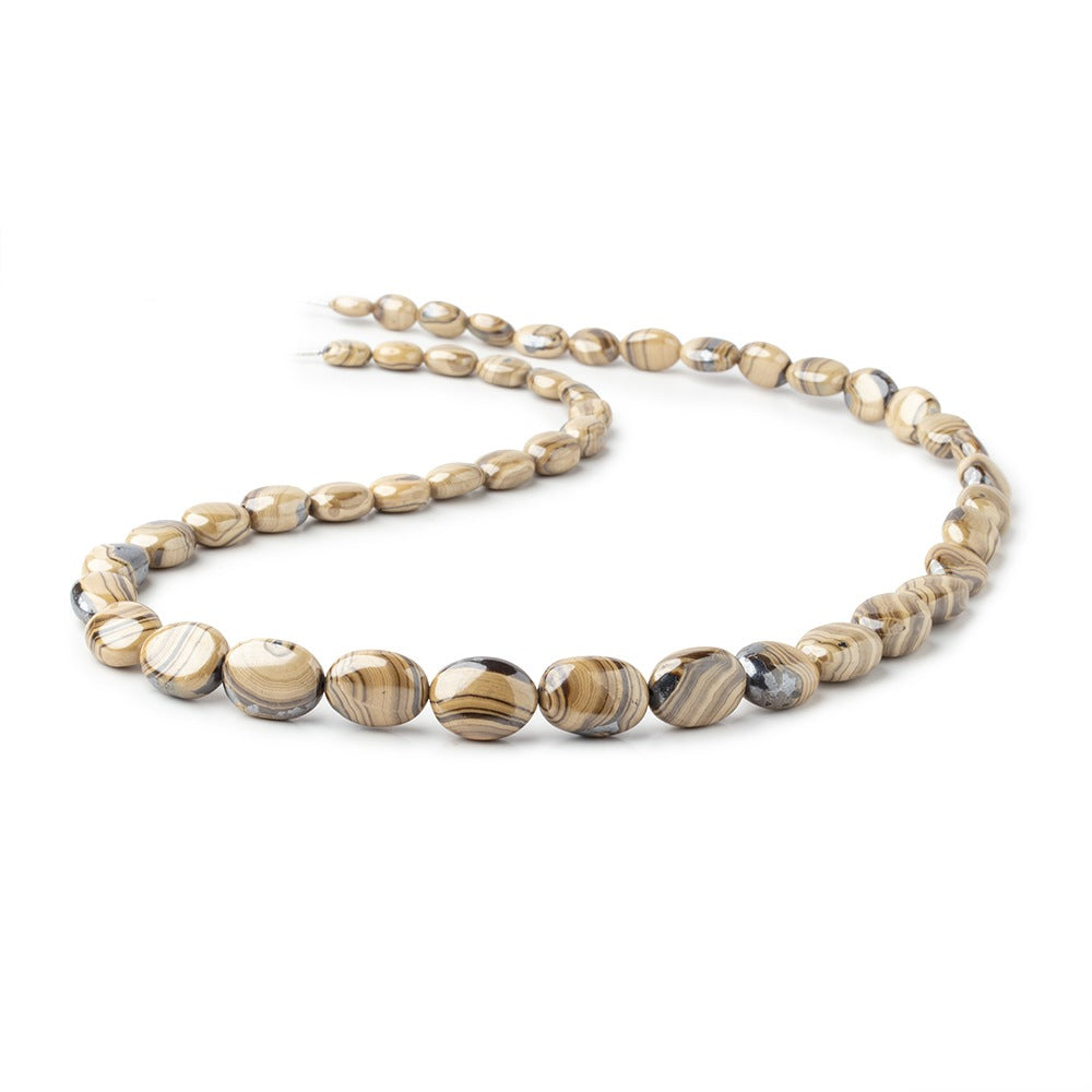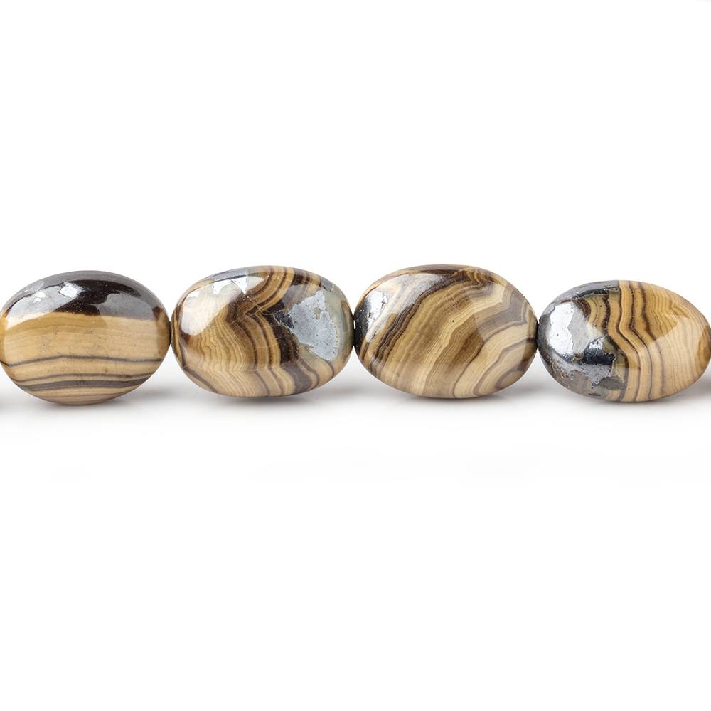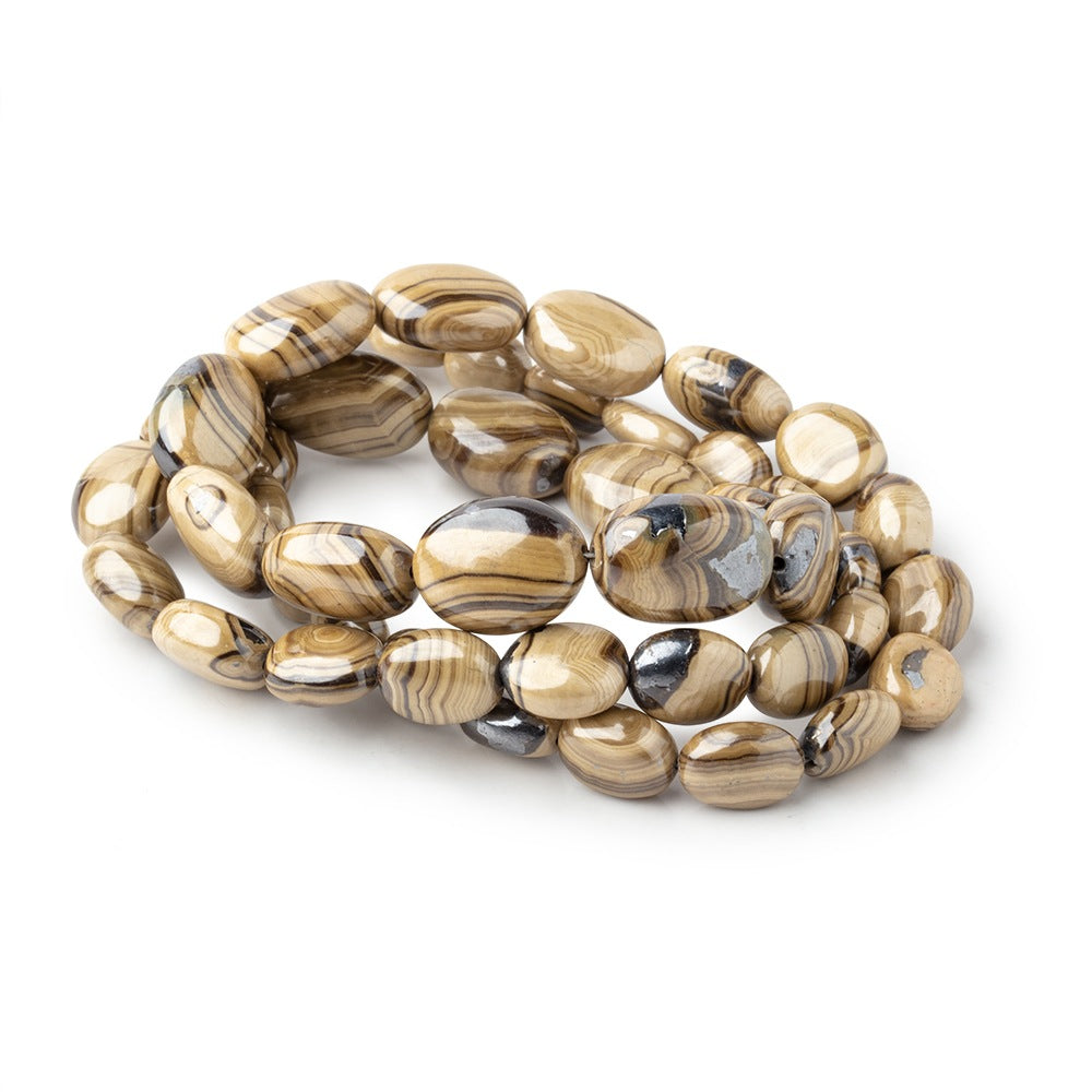 Schalenblende plain nugget beads present as an opaque banded formation polished to reveal concentric Sphalerite and Wurtzite with metallic areas of Galena. Schalenblende consists of alternating bands of brown-yellow sphalerite, brunckite and wurtzite, and lustrous galena of which Sphalerite and Wurtzite are fluorescent in UV light. These beads are asymmetrical and have bountiful areas of metallic grey and banded golden yellow and brown hues. AA Rare gemstone mined in Poland