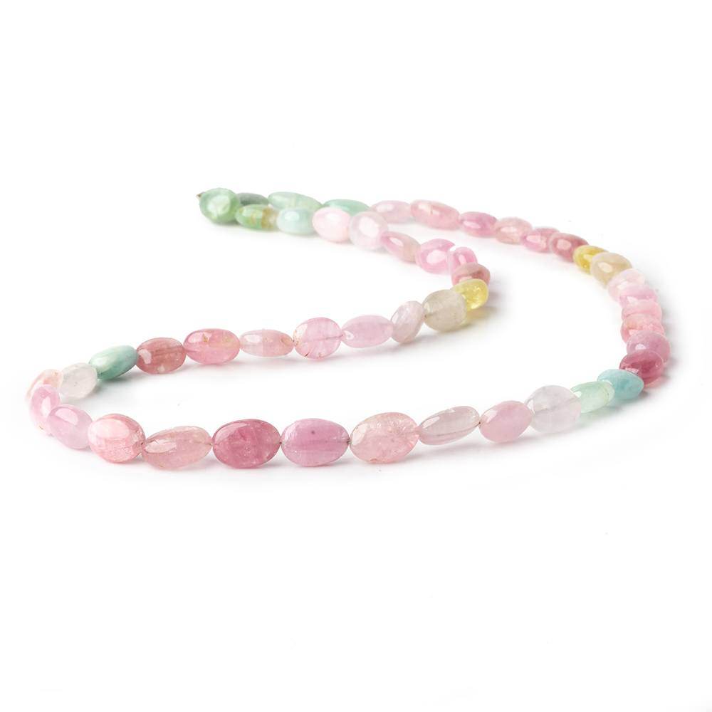 Afghani multi-color Tourmaline plain oval nuggets measure approximately 7x6x5mm up to 9x6x4mm in size, these beads have a superior glass like luster with excellent polish on an asymmetrical oval nugget shape, Afghani tourmaline beads exhibit a medium light saturation of pink, greenish yellow, yellowish pink, mint green, Indicolite & watermelon (bi-color green & pink) hues, these gemstones are translucent with internal characteristics, gems are wonderfully matched for coloring patterning on the strand for these Tourmaline gemstones from Afghanistan, and the gems show great color in a full-bodied nugget of average size.