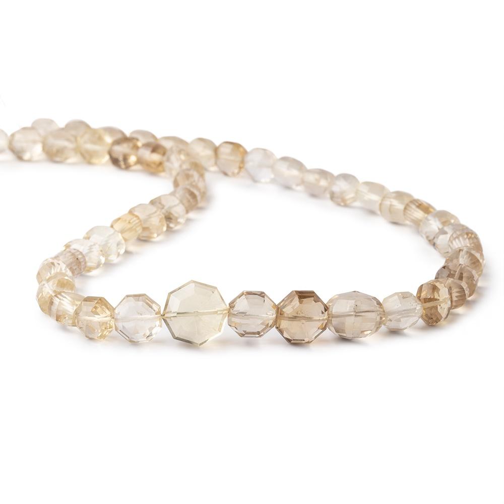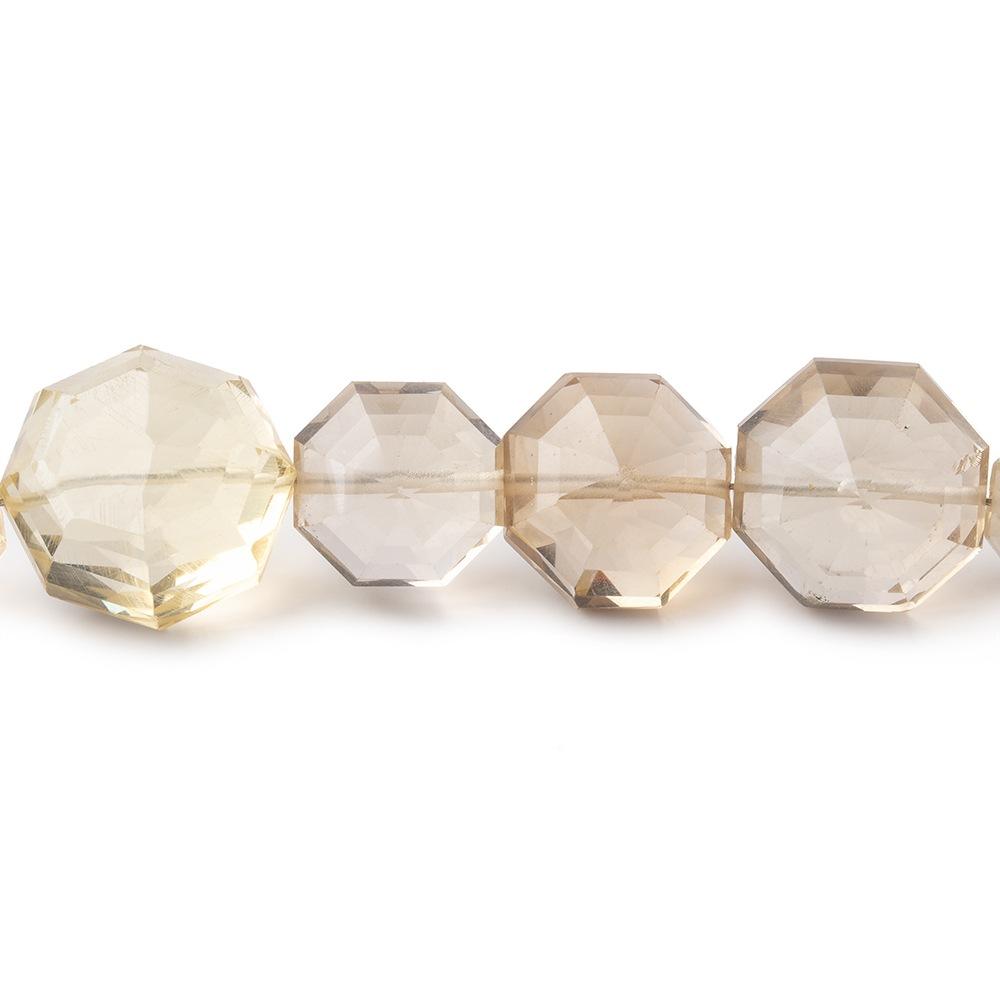 Multi Gemstone Faceted Octagonals have a vitreous luster, excellent faceting creating a symmetrical two-sided faceted octogon shape, the bead bodies are transparent with slight internal characteristics, and the gemstones are an assortment of Lemon Quartz, Crystal Quartz, and Champagne Quartz with high brilliance.