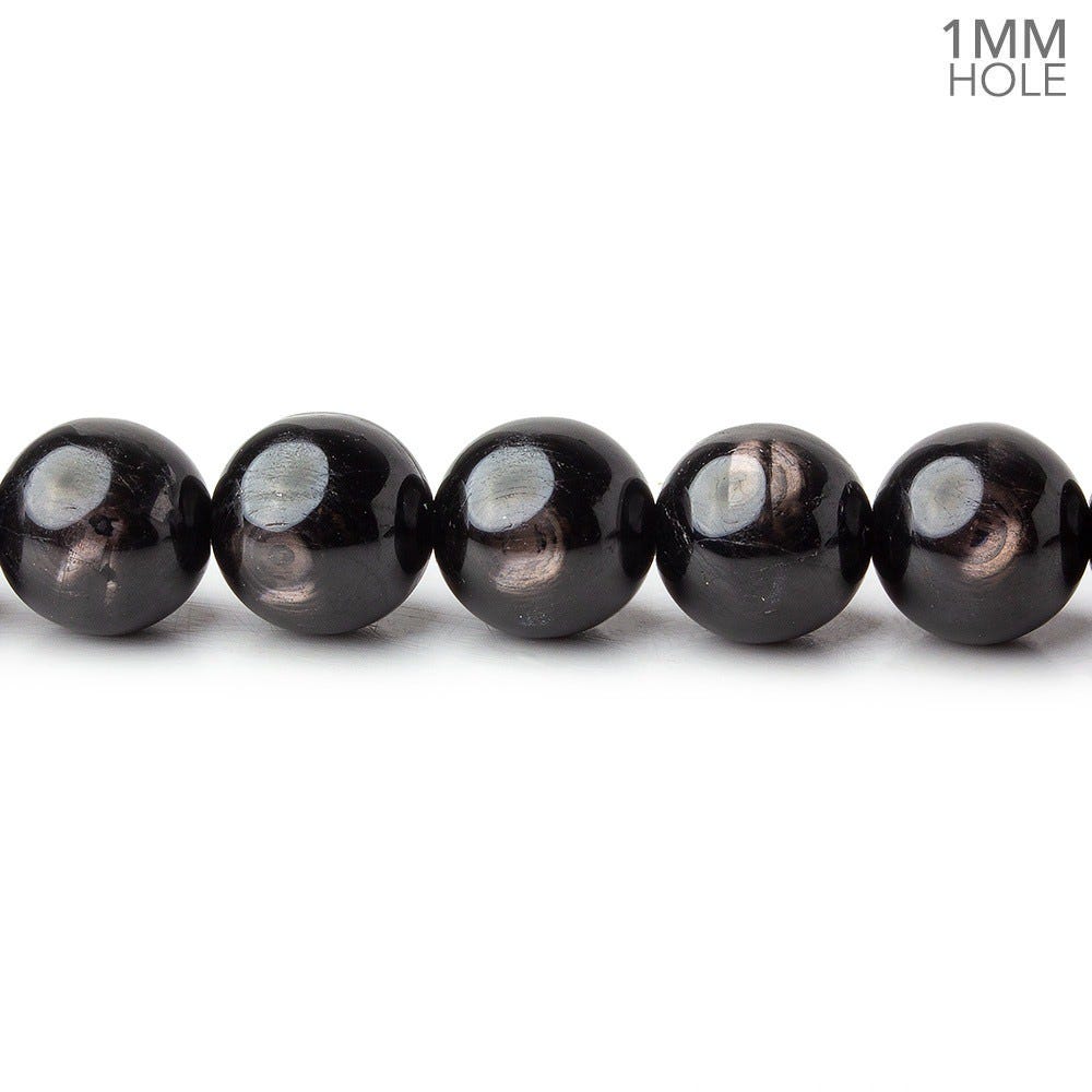 Hypersthene plain round beads exhibit a metallic shiller, show an excellent polish, provide a symmetrical shaped, and have an opaque body having a consistent 1mm interior diameter drill hole. These hefty Hypersthene gemstones are a deeply saturated brown hue appearing with metallic internal shiller.