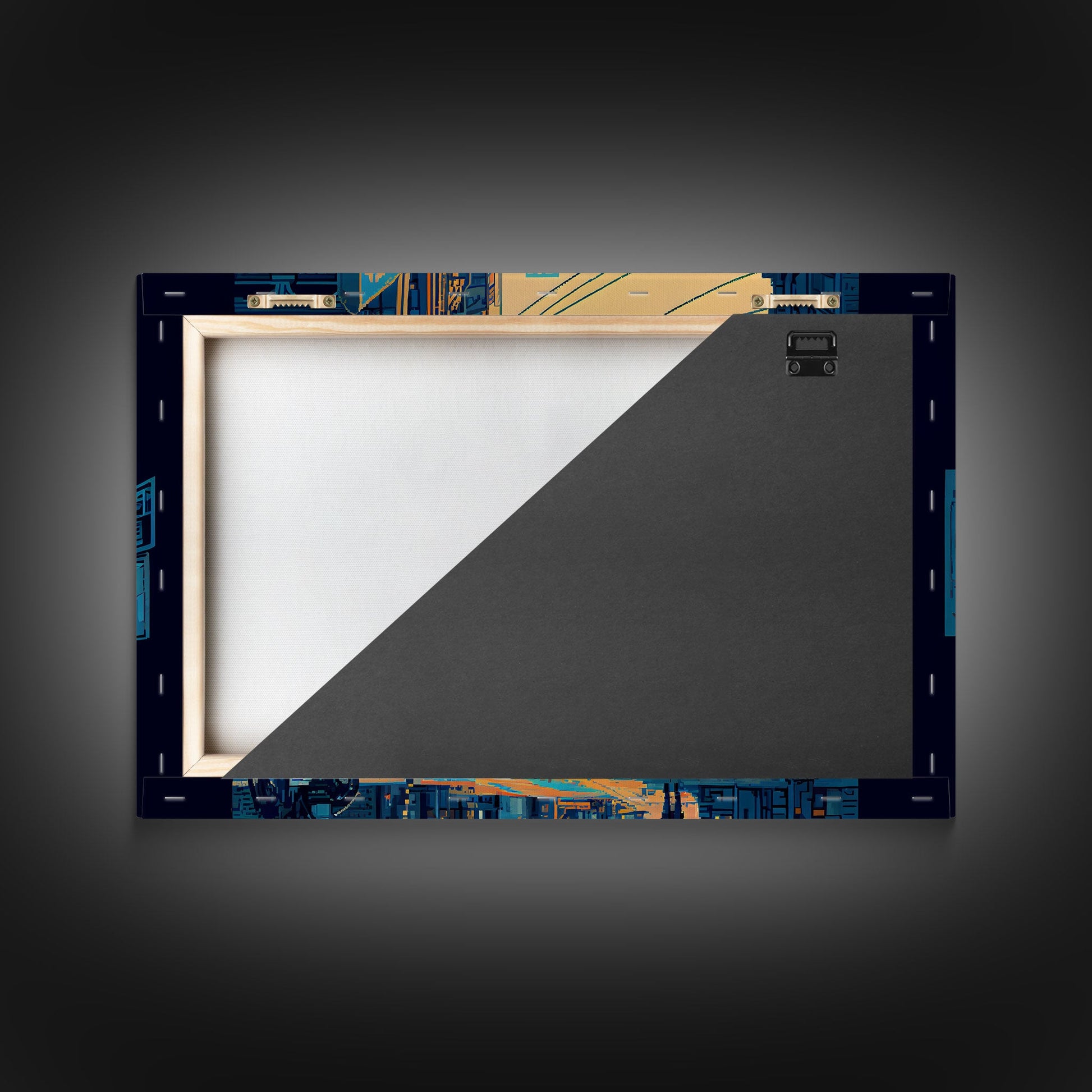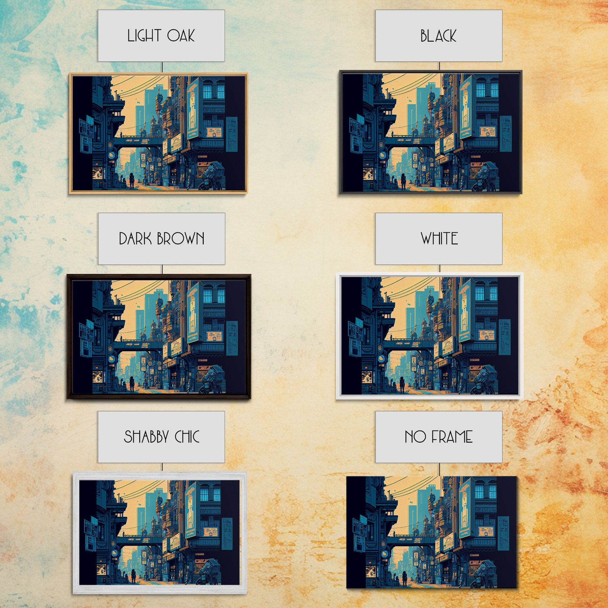 8 bit pixel art cyber punk city, video game concept art, framed canvas print, game room art