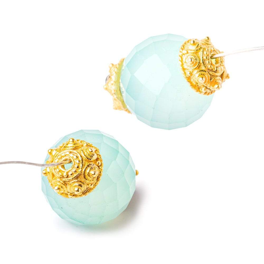 These 22kt Gold plated Copper bead caps have been created specifically for us. The unique miligrain and design features contain elements that will match other design elements throughout our metal bead collections. This particular group has been E Coated to ensure protection from the elements. These beads have a hole measuring approximately 2mm Inside Diameter.