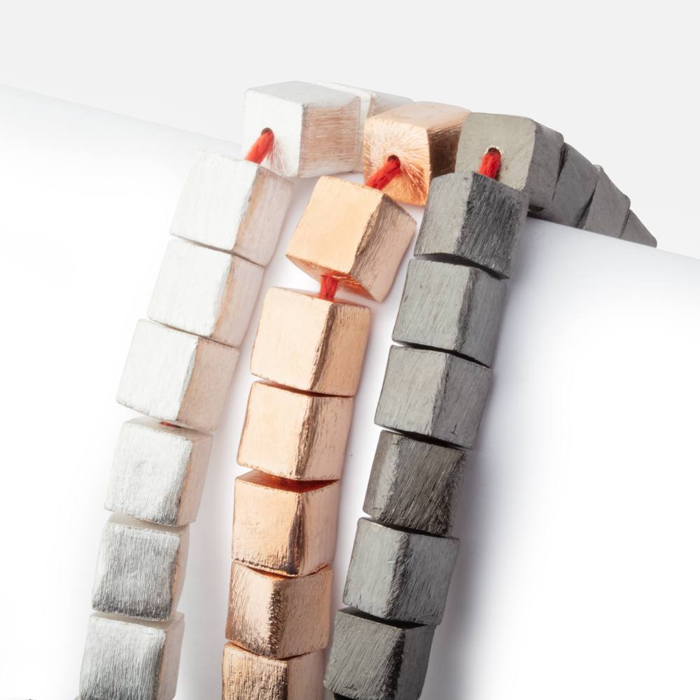 8x8x8mm Plain Cube Beads have a 1.5mm drill hole and are plated over Copper with a Brushed finish. These 8 inch strands of beads are available in Silver, Rose Gold, and Black Gold plating.