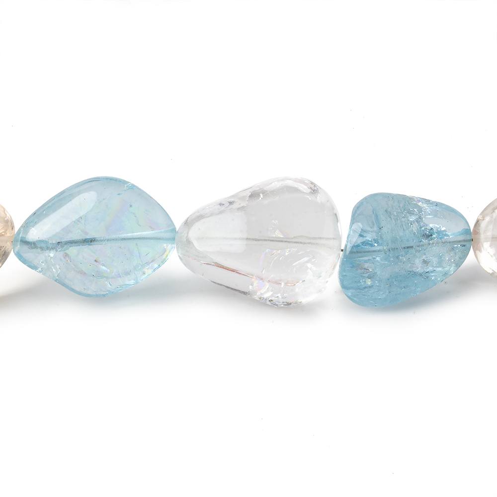 Multi Beryl plain nuggets show as brilliant, well made asymmetrical and smooth beads having a transparent quality exhibiting internal characteristics within these moderately saturated Morganite (pink) and Aquamarine (blue) beads.