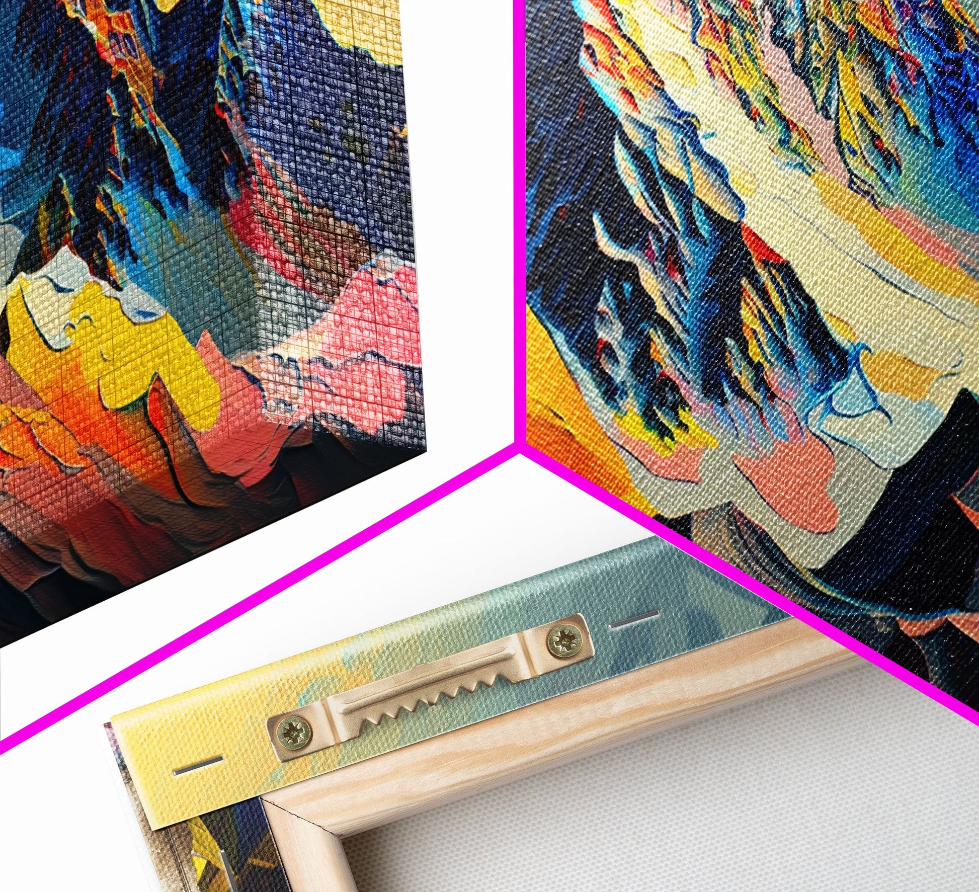 Hello and thank you for taking the time to view our modern high quality giclée artwork! We offer both posters and stretched canvas prints. Our posters are printed on Ultra Matte 60 lb / 230 GSM high quality photo paper, with a thickness of 10 mil. Our canvases are printed on museum grade 350 GSM canvas material with ECO friendly archival grade ink, then hand stretched and stapled over premium, FSC certified and shrink resistant frames. Designed and built to last a lifetime.