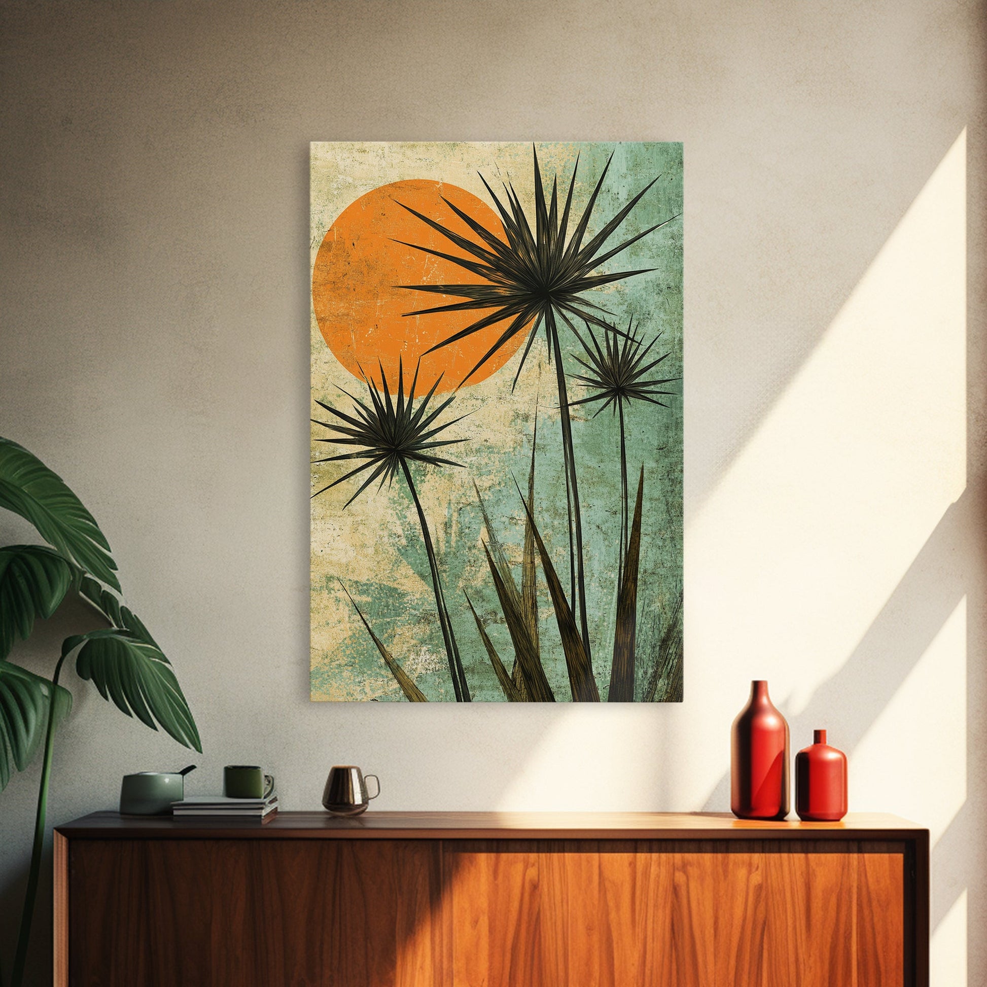 Abstract Palm Trees at Sunset, Framed Canvas Print, MCM Style Wall Art