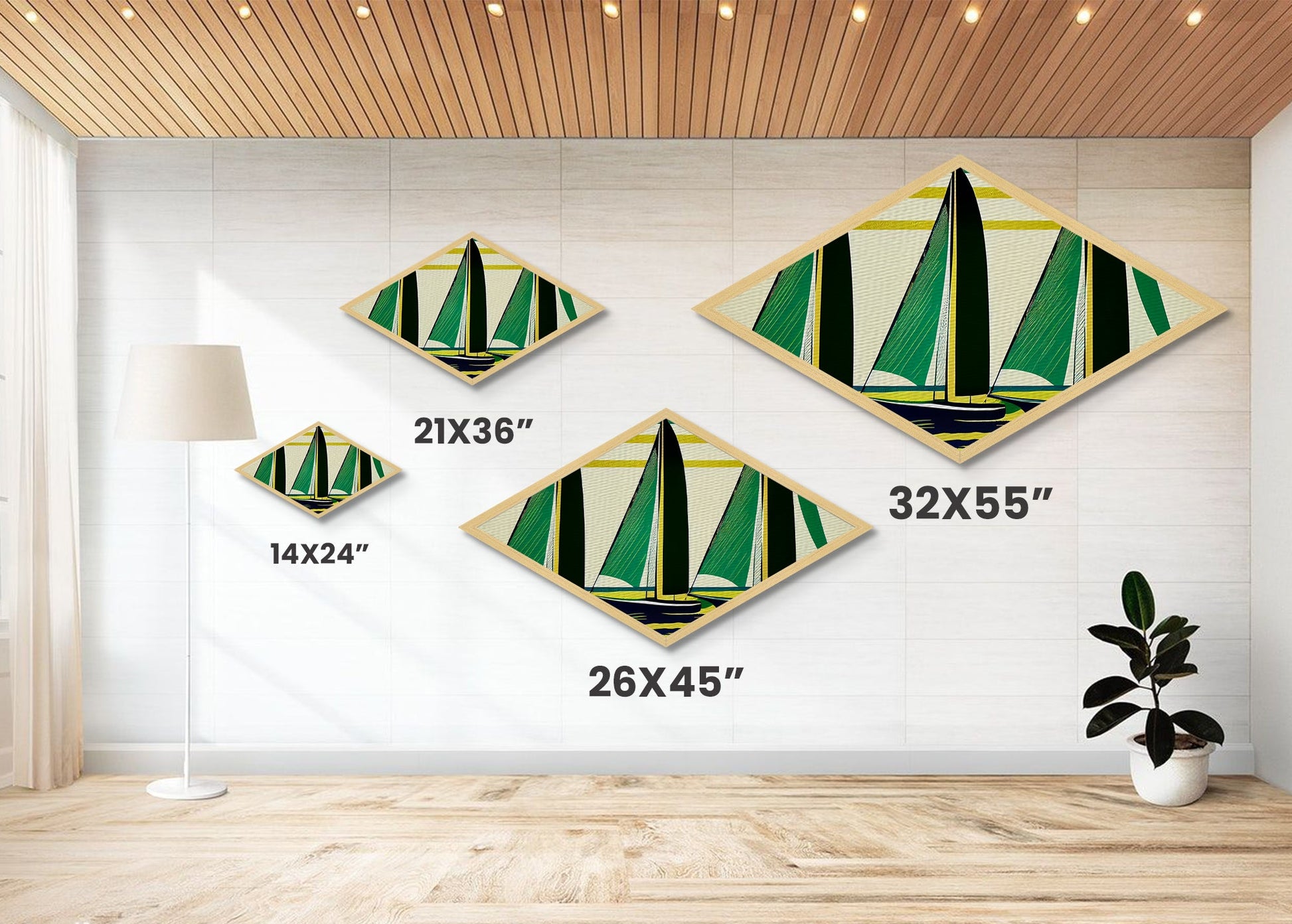 Abstract Sail Wind – Diamond Shaped Canvas Textured Print with retro sailboat geometry, green yellow nautical minimalist coastal theme