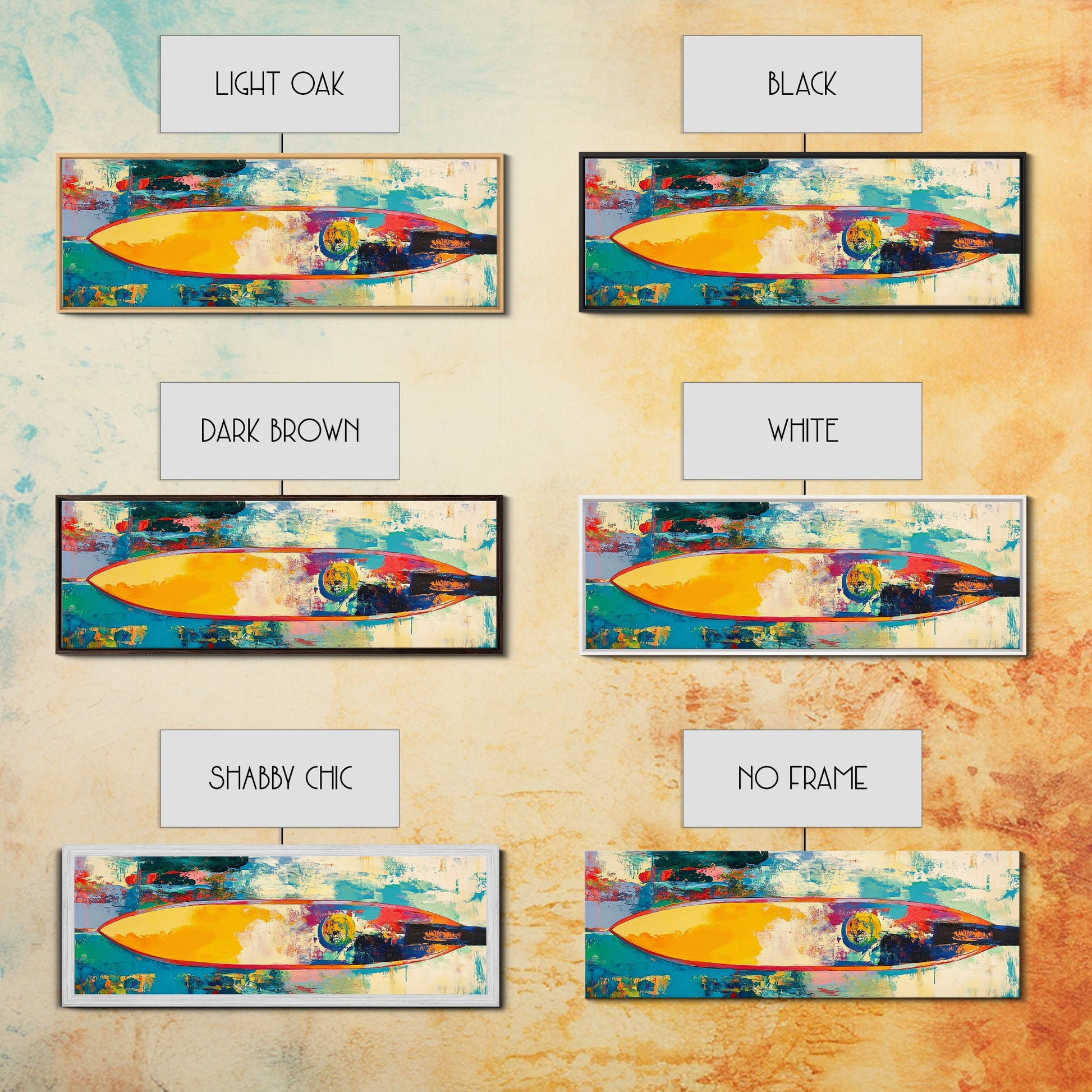 Abstract Surfboard Framed Canvas Print Coastal Beach House Wall Art, Vibrant Surfing Decor, Colorful Ocean Painting, Modern Boho Art