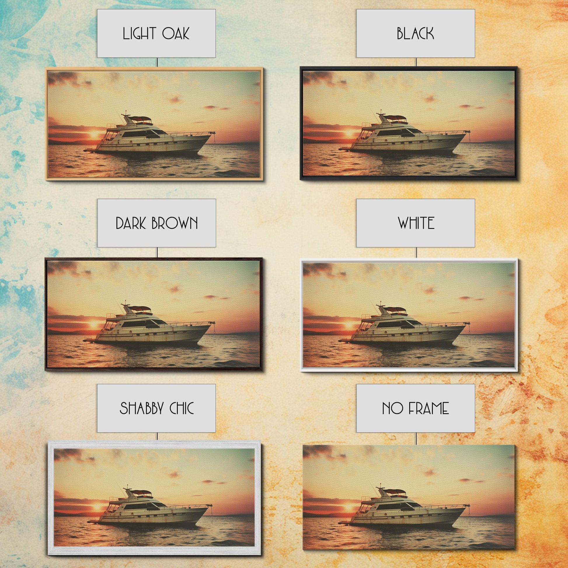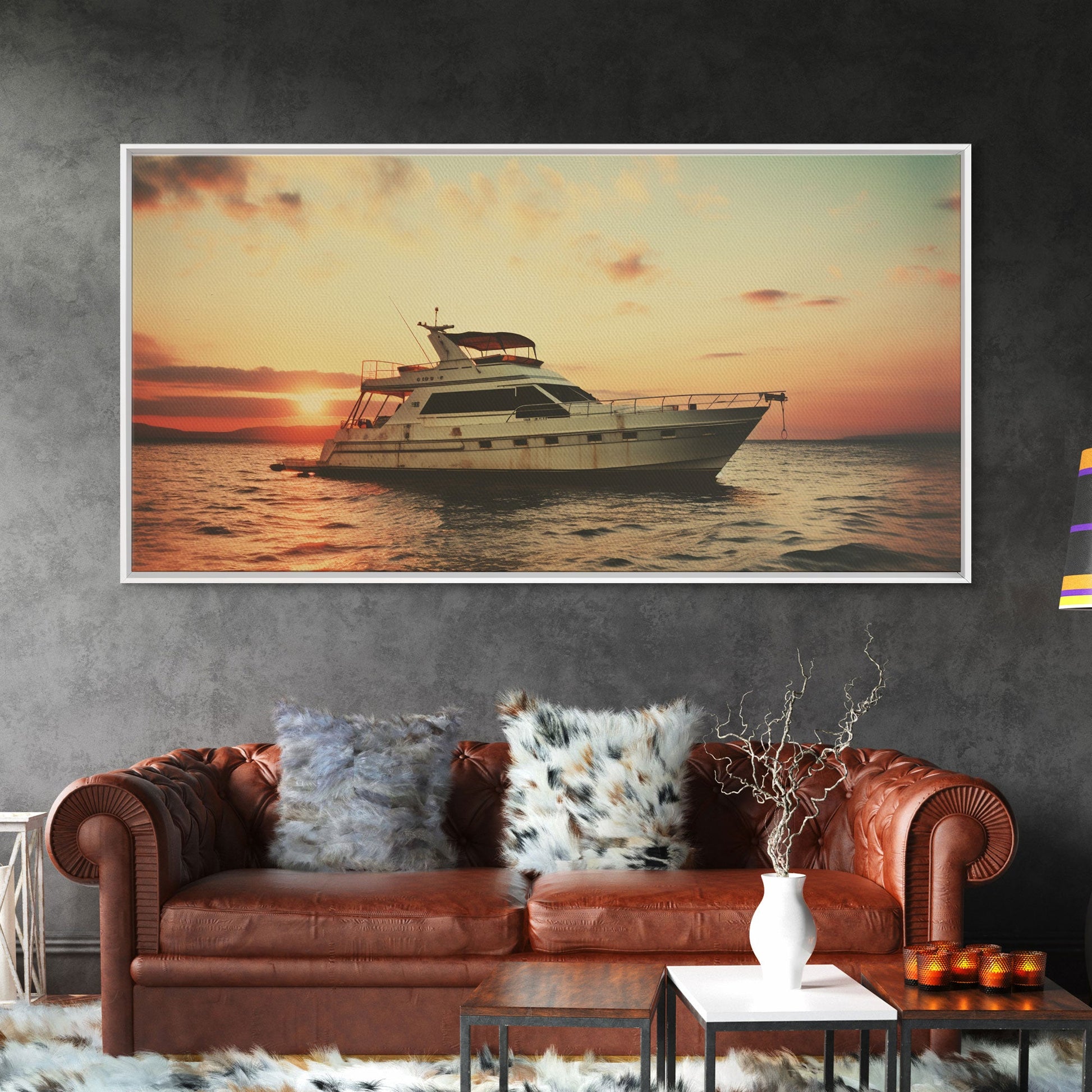 An Abandoned Yacht at Sunset - Framed Canvas Print - Nautical Decor - Vaporwave Art - Liminal Spaces - Urban Decay - Eclectic Wall Art