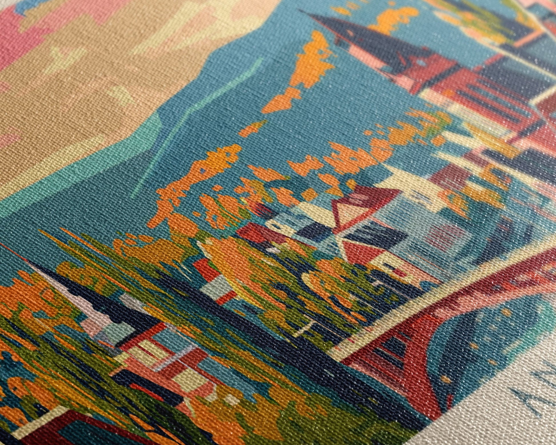 Most of our canvases are made in the USA, with the exception of canvases ordered with the light oak unstained frames, and any large canvases (24x48, 30x60, 16x48 and 20x60) ordered WITH a frame. These are temporarily made in and shipped from Europe, while we try to find a more consistent supplier in the USA.