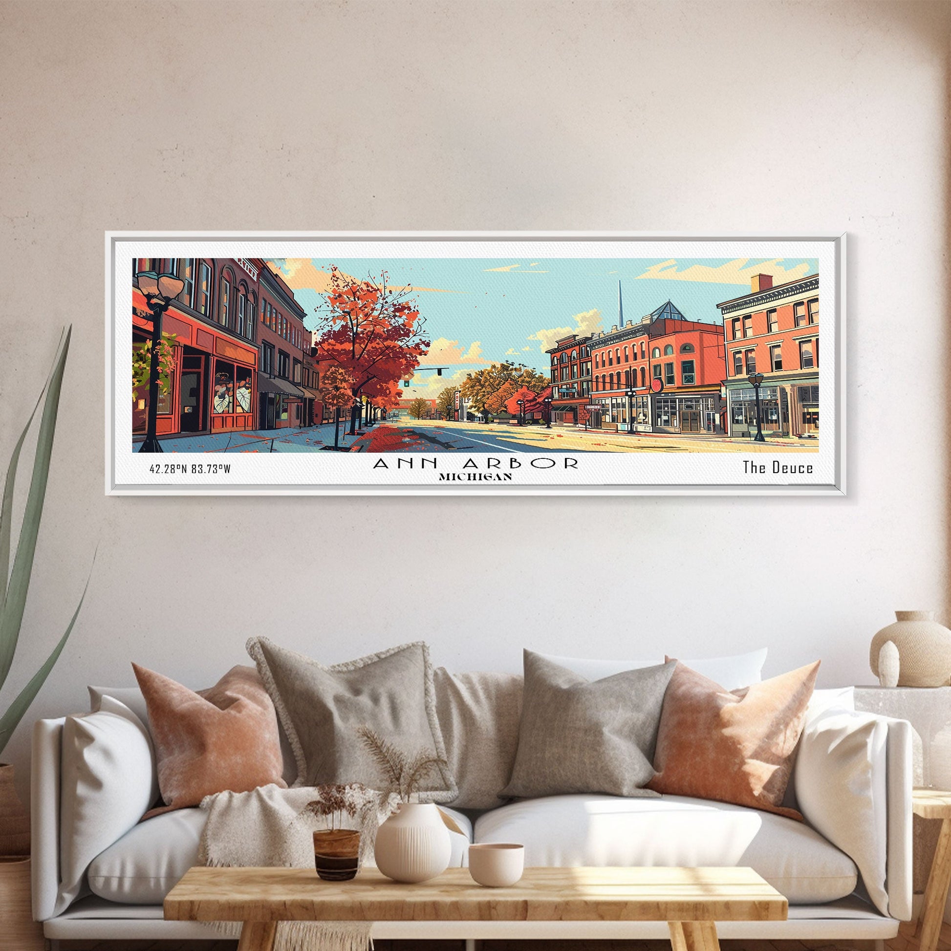 Ann Arbor Michigan Panoramic Painting, Mid Century Modern Framed Canvas Print, Retro Pop Art Travel Poster, Office Art, City Print