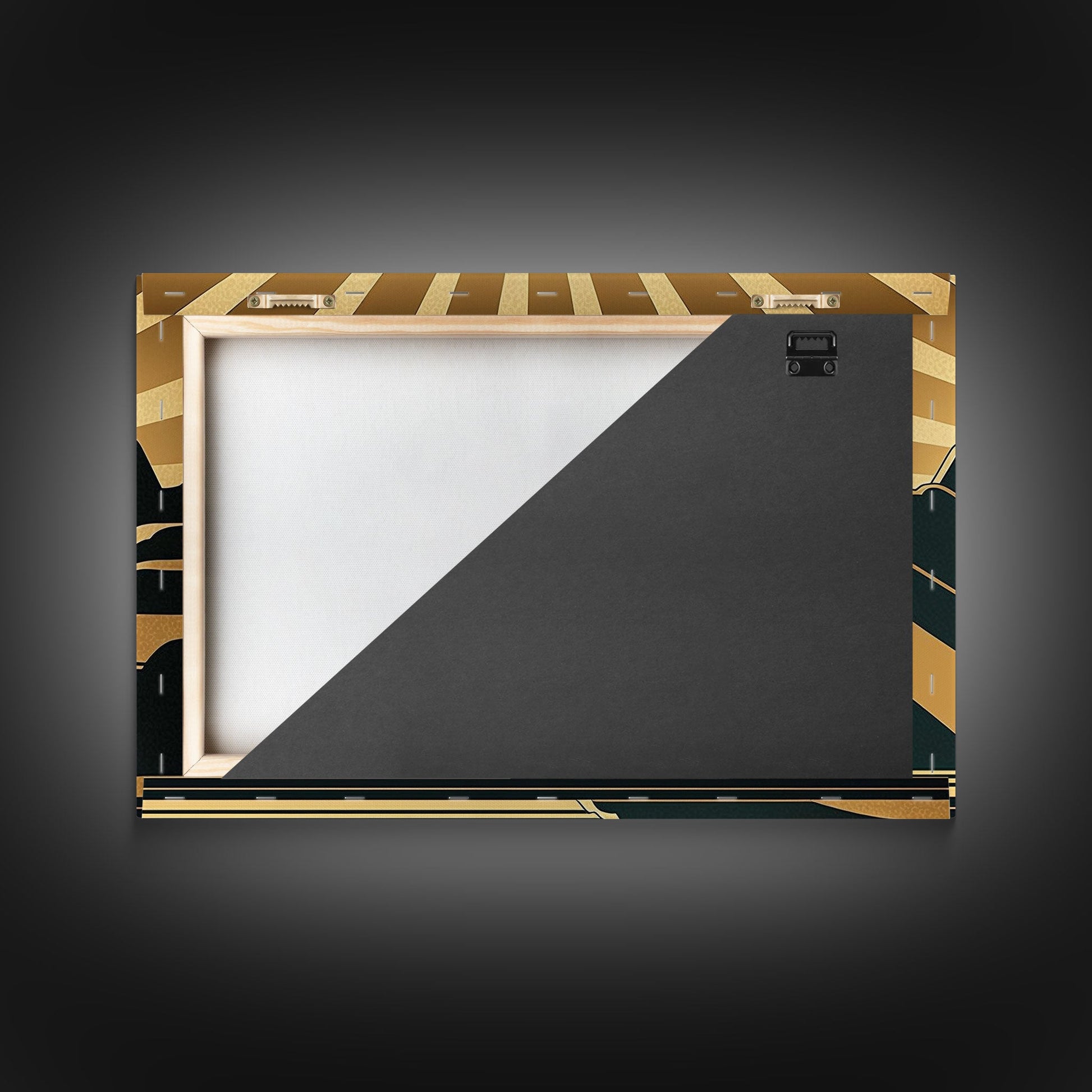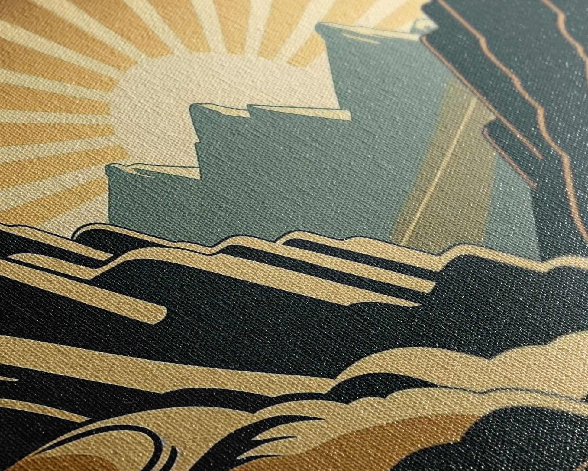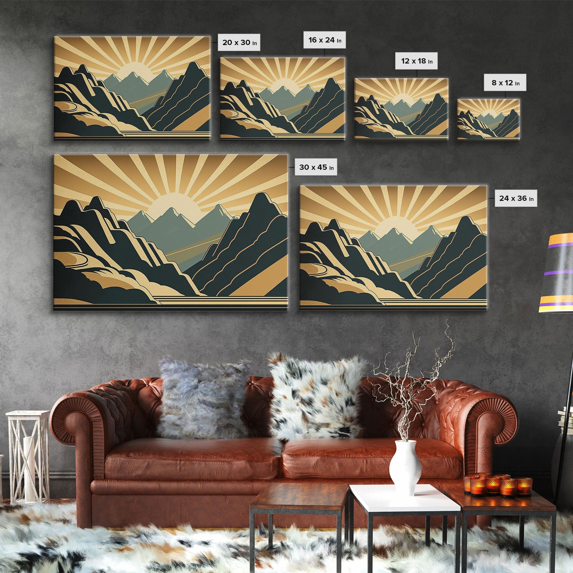 Art Deco Style Mountain landscape at Sunset, Framed Canvas Print, Large Format Wall Art, Huge Wall Decor