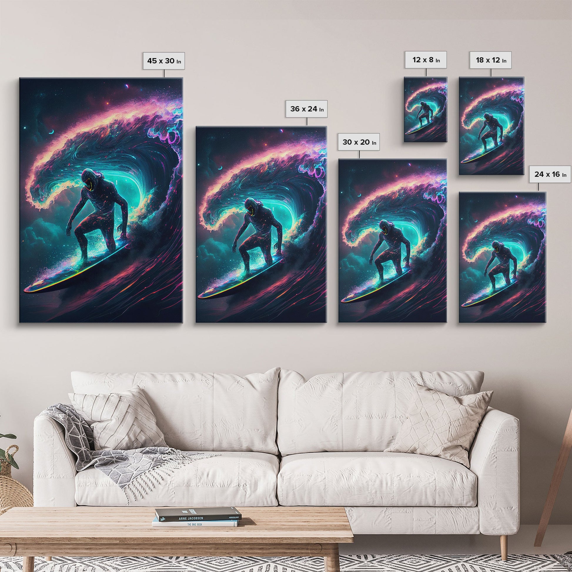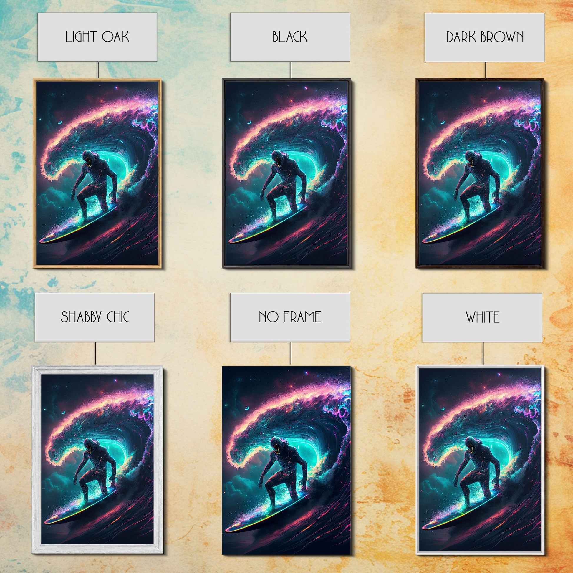 Astronaut surfing the stars, Cosmic Surfer, Galaxy Art, framed canvas print, unique colorful wall art