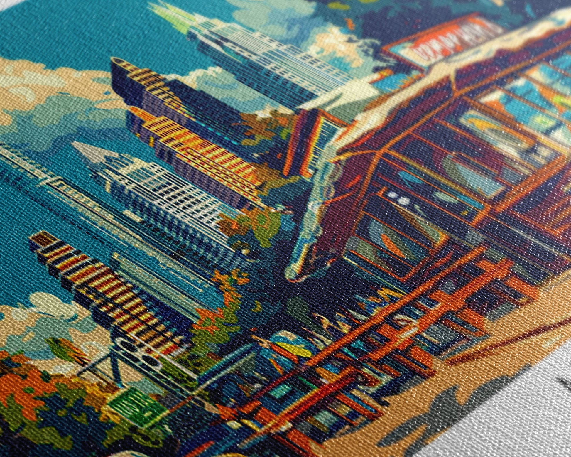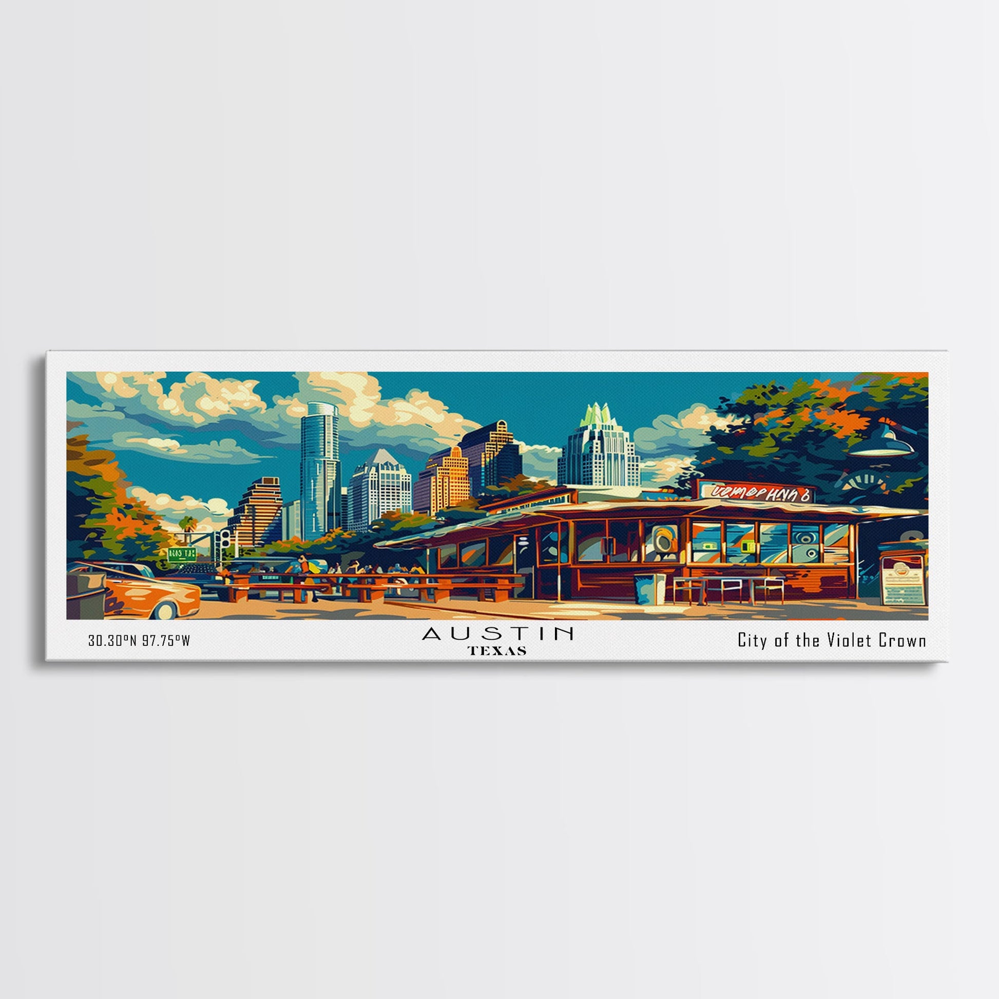 Austin Texas Panoramic Travel Poster Framed Canvas Print, Mid Century Modern Art, Pop Art Style, Wall Art Decor, Home Decoration