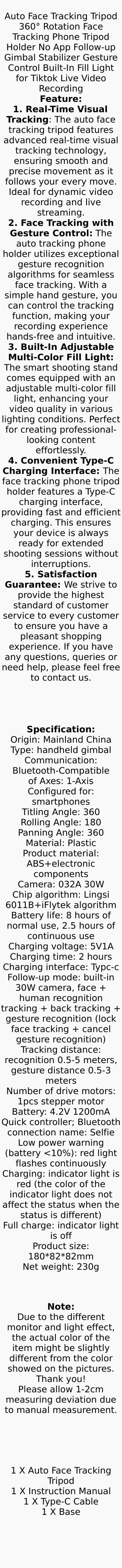 Introducing the Auto Face Tracking Tripod with 360° Rotation – the perfect companion for content creators and social media enthusiasts! This innovative device ensures your videos are always in focus and perfectly framed, making it essential for TikTok recording and live streaming.