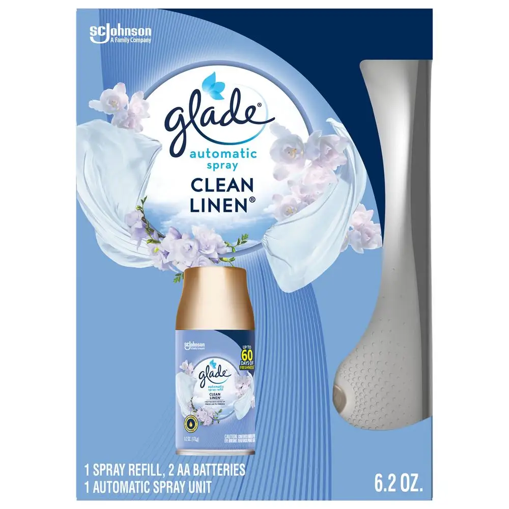 Keep it clean with air with our complex blend of Glade Clean Linen Automatic Spray Holder + Automatic Spray Refill. Decorate the air with this scent diffuser with notes of crisp air, fresh laundry, and lily of the valley. Glade air freshener fragrance is crafted by master perfumers. Switch things up with automatic air freshener dispenser in Clean Linen scent. Open the unit by squeezing the ribs on the side while pulling sides of holder apart. Insert Glade automatic spray refill and choose the time setting to release fragrance. This automatic air freshener spray gives a fresh burst every 9, 18 or 36 minutes. Surround yourself with room freshener fragrance infused with essential oils and wrap yourself in laundry bliss.
