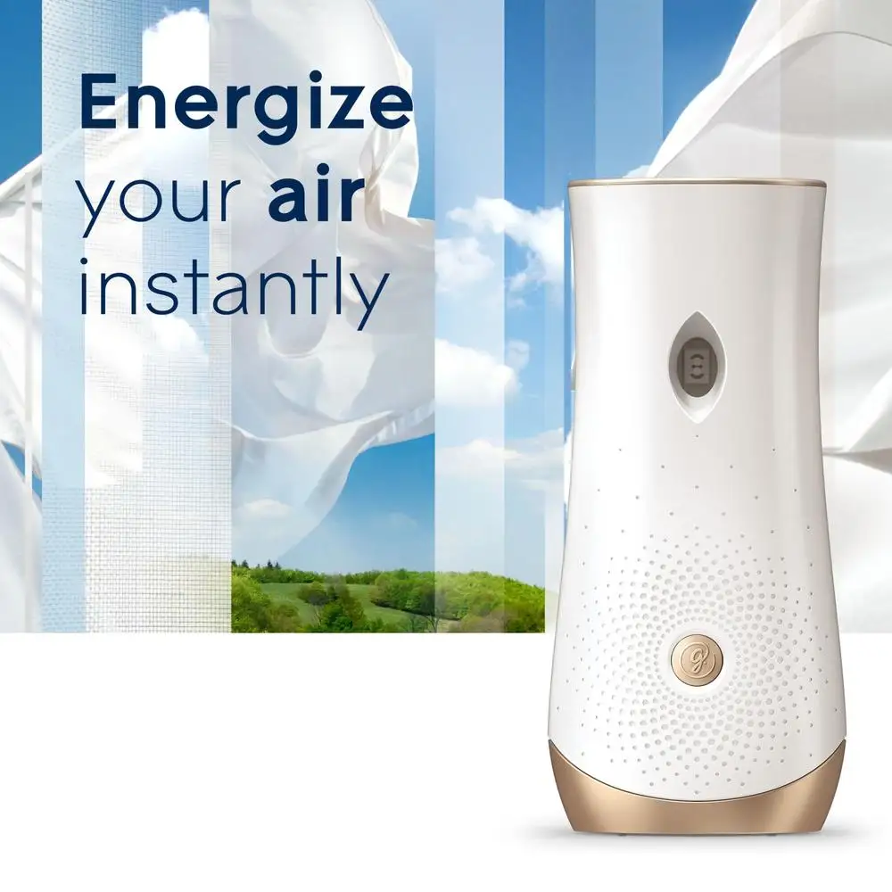 Energize your air instantly with Glade Automatic Spray Air Freshener Enjoy a fresh burst every 9, 18 or 36 min for a timed fragrance release Decorate the air with Glade automatic spray with notes of crisp air, fresh laundry, and lily of the valley This Glade air freshener fragrance is crafted by master perfumers and infused with Essential Oils™ Boost the fragrance of any room with battery operated air freshener