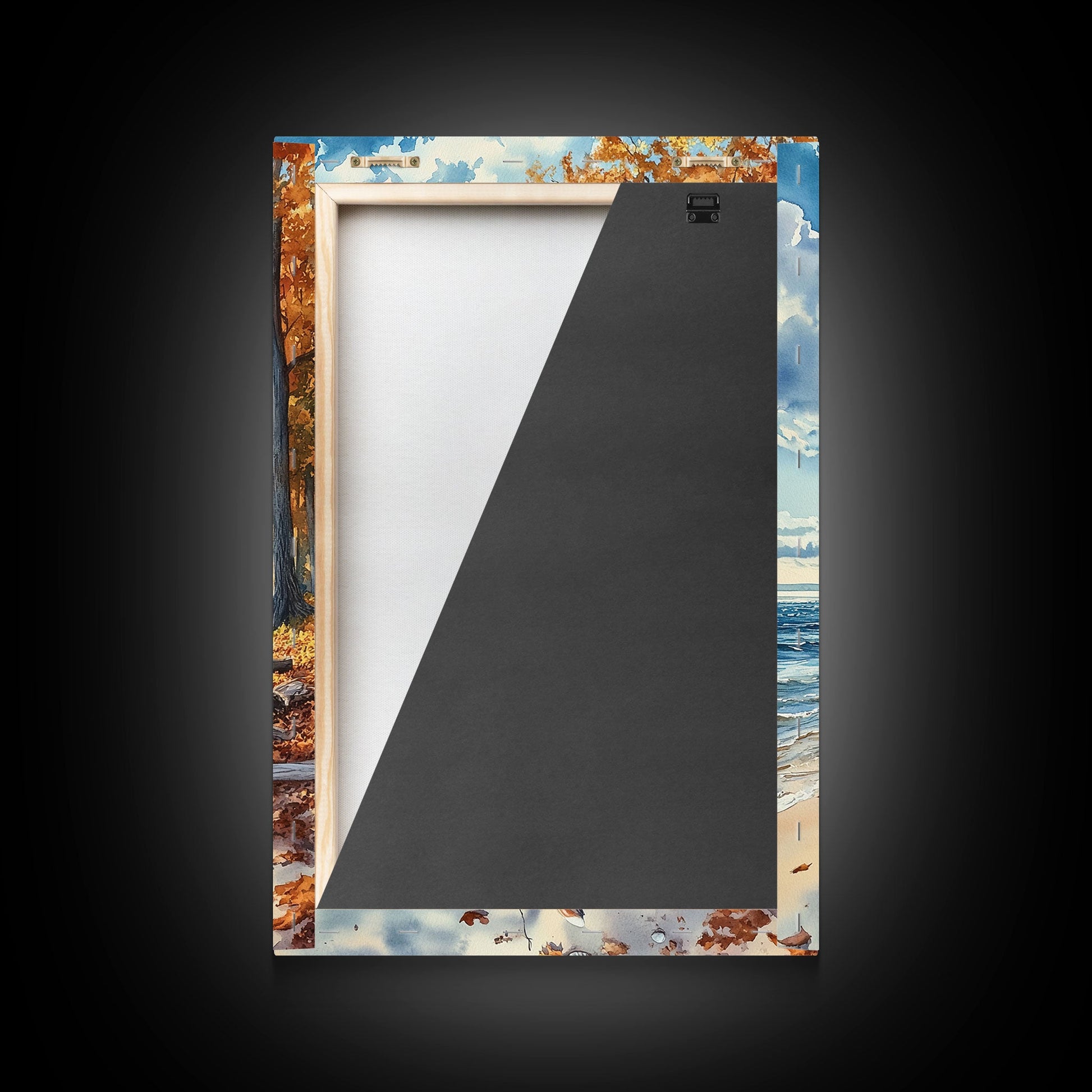 Autumn beach landscape with vibrant fall leaves and coastal breeze Framed Canvas Print perfect fall wall art for seasonal farmhouse decor