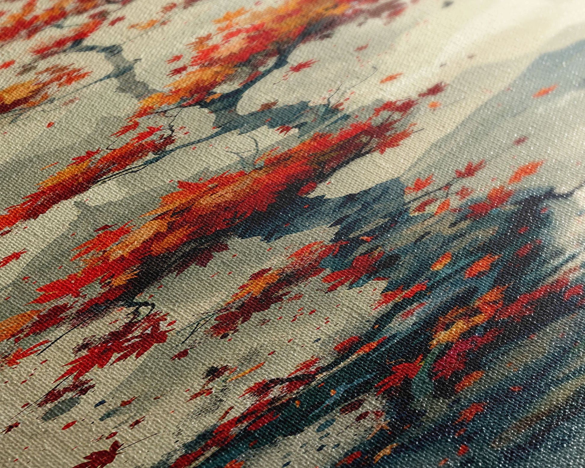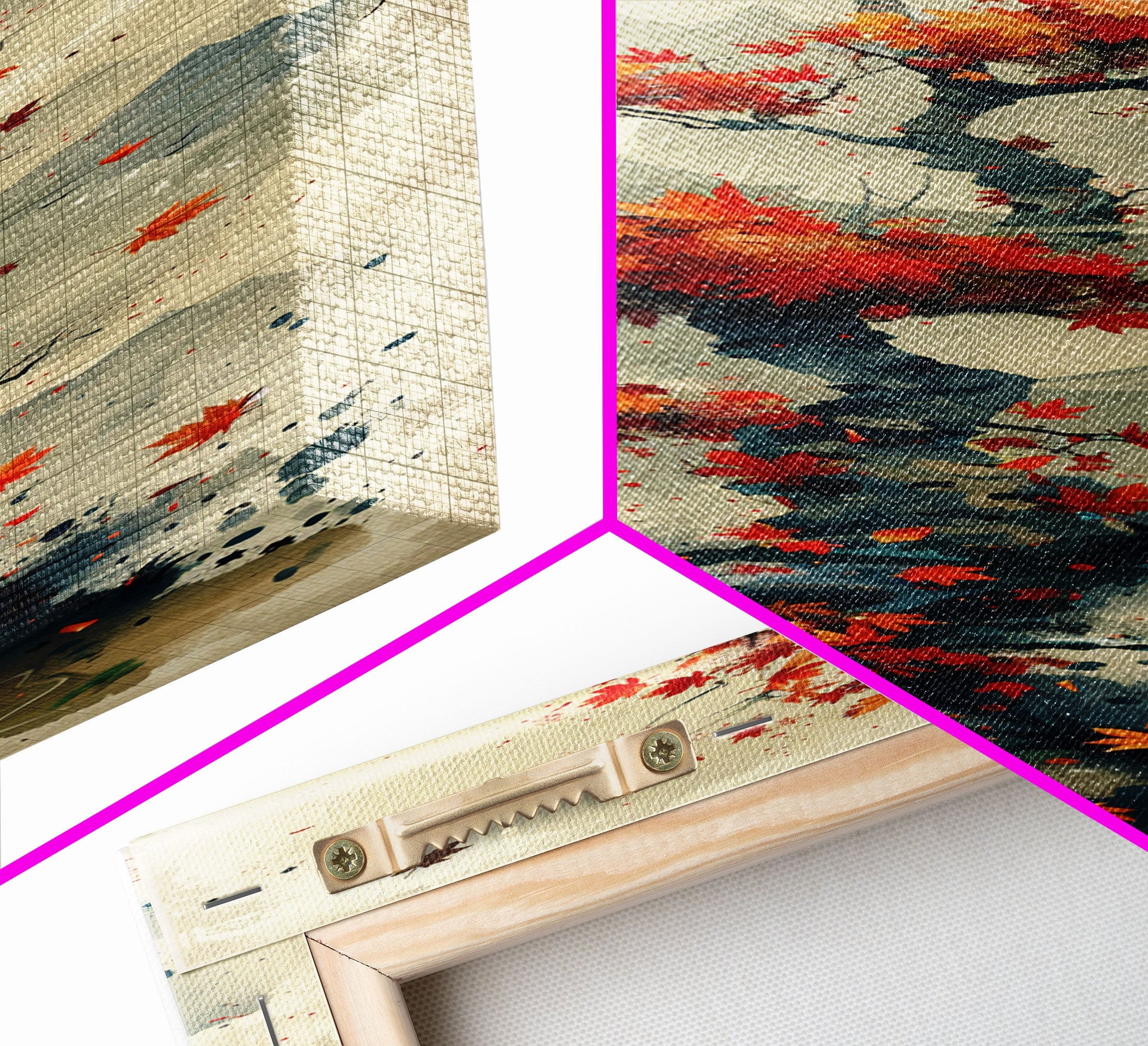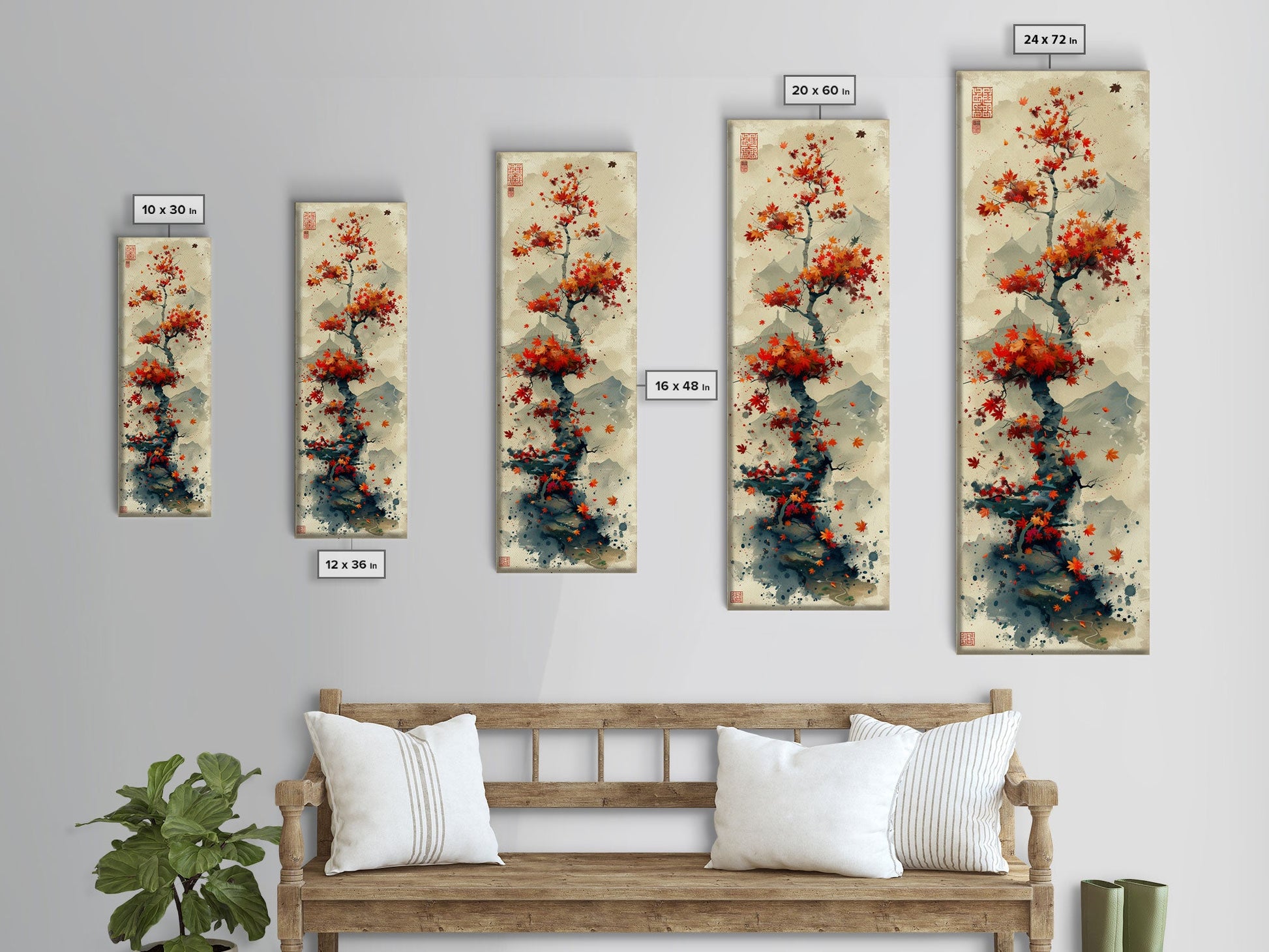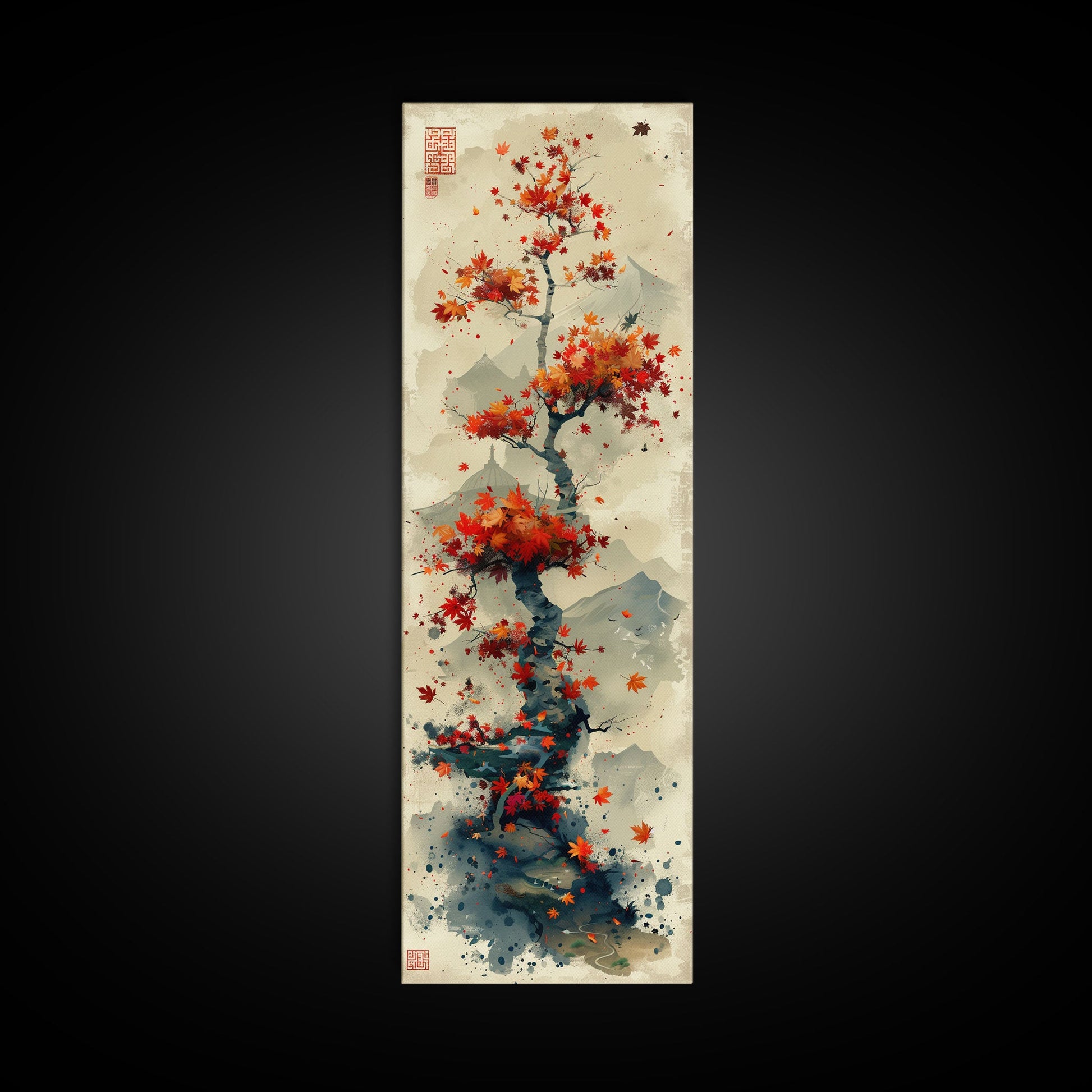 Autumn Bonsai Tree Traditional Japanese Style Nature Art On Framed Canvas Print In Ukiyo-e Art Design Tall Skinny Wood Block Wall Decor