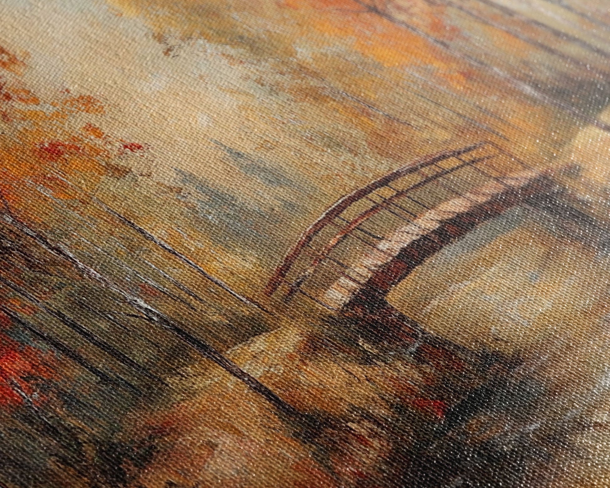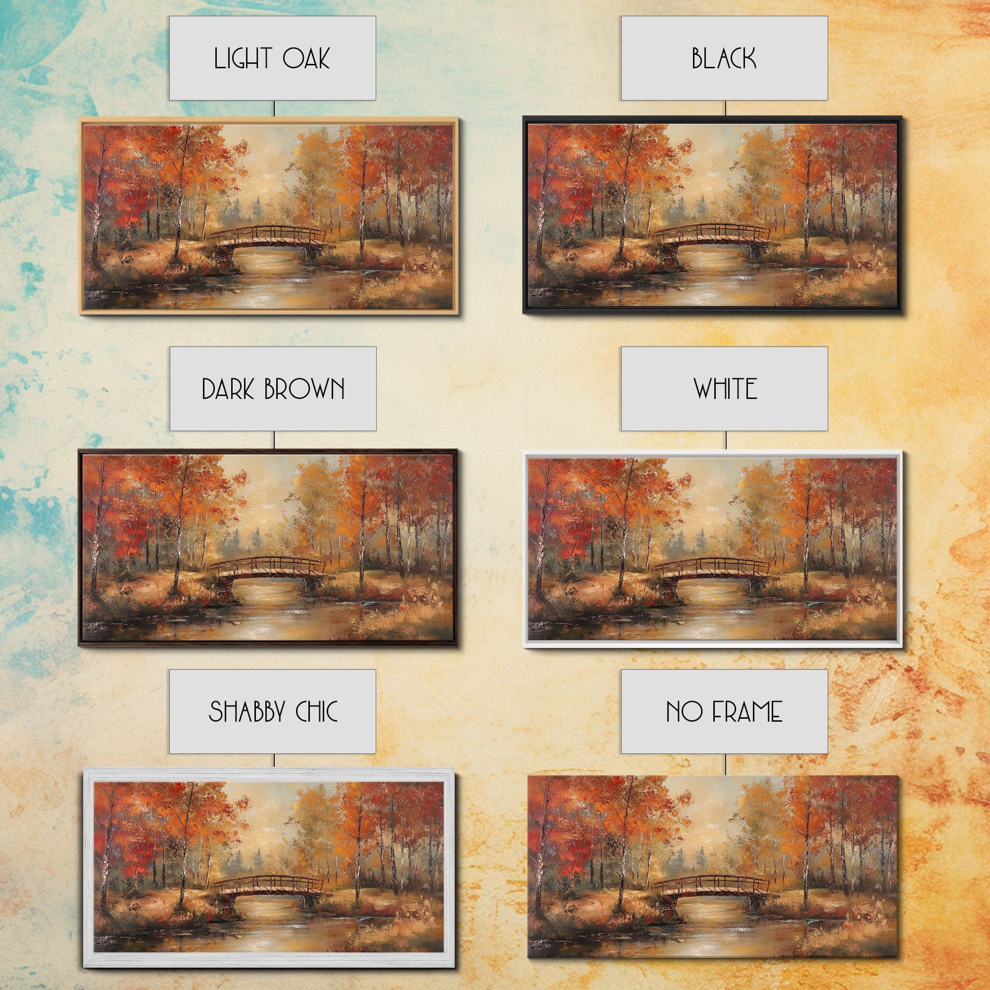 Autumn Bridge Over Quiet River Tall Art Framed Canvas Print Serene Fall Landscape With Colorful Foliage And Peaceful Reflections