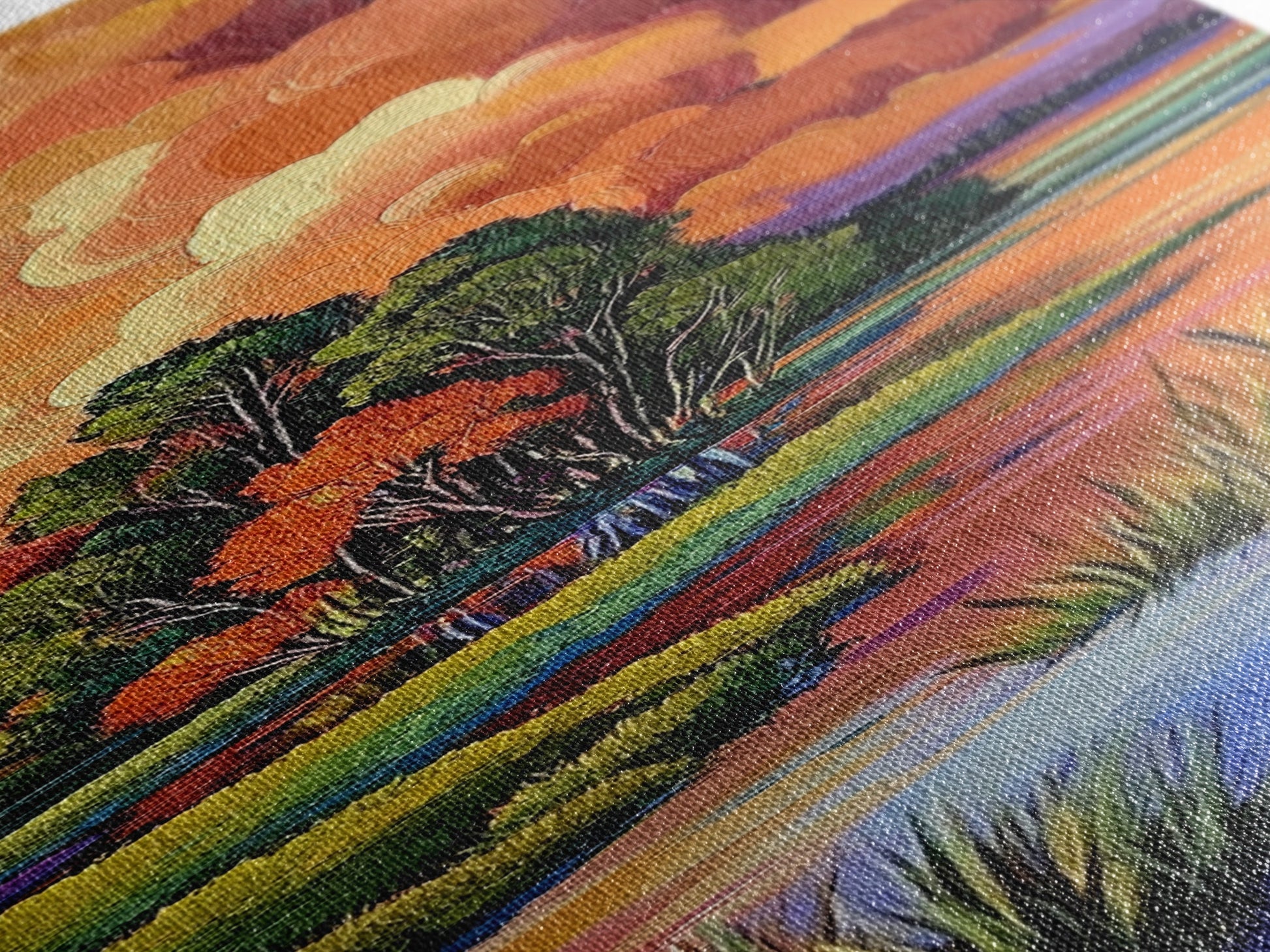 Autumn Marsh, Sunset Glow, Serene Trees, Framed Canvas Print, warm fall landscape art, peaceful country home decor, boho wall design