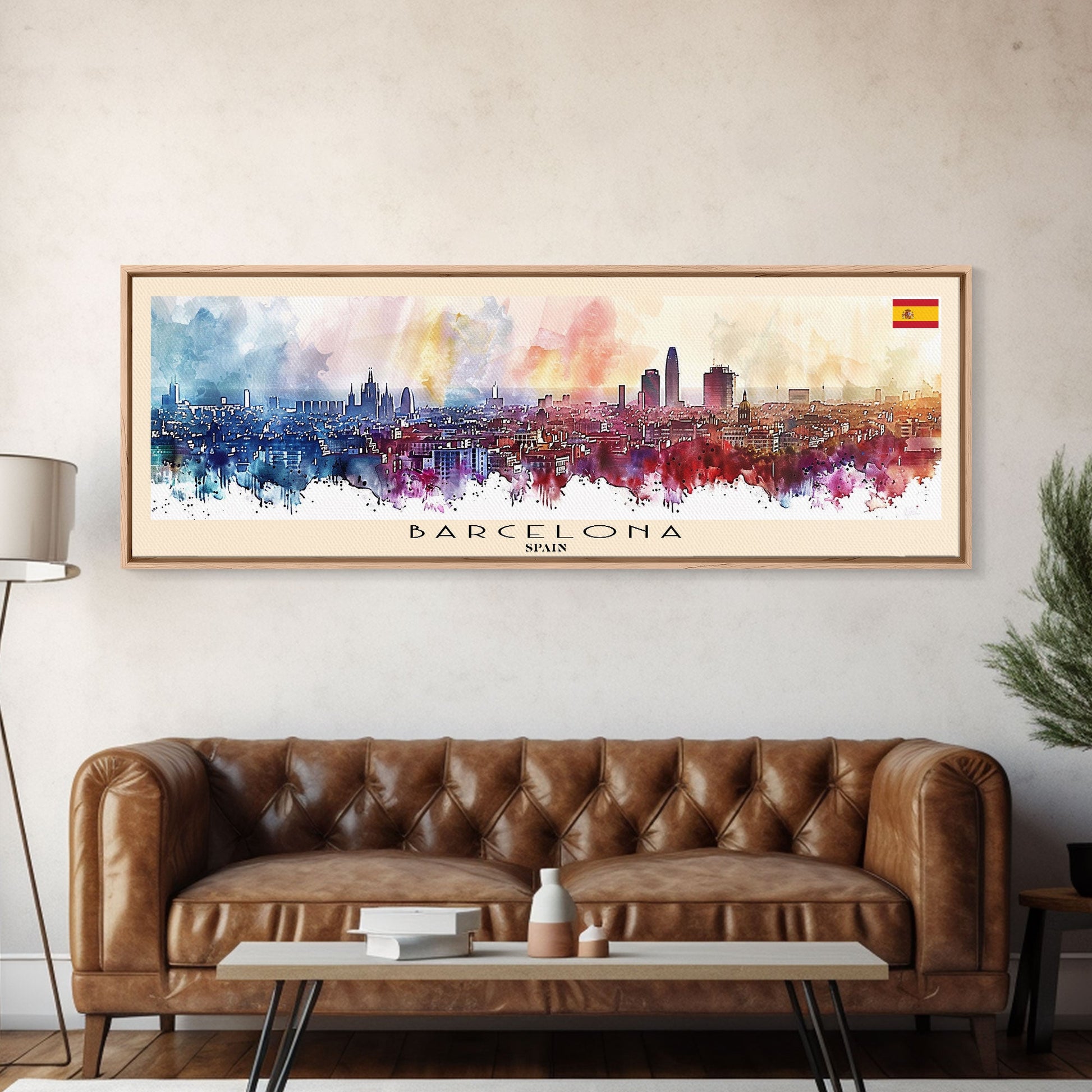 Barcelona Spain Travel Art, City Art, Framed Canvas Print or Metal Wall Art, Europe Travel Poster, Panoramic Wall Art, Extra Wide Wall Art