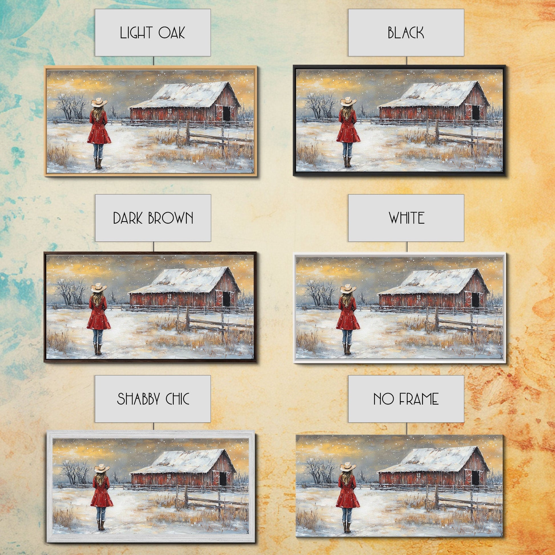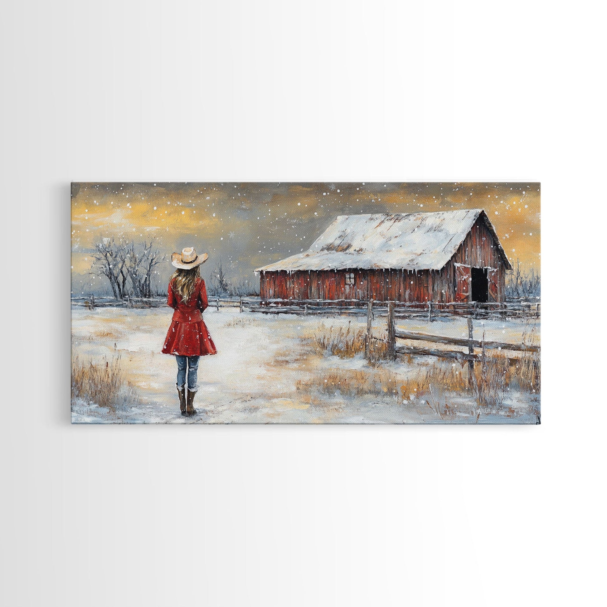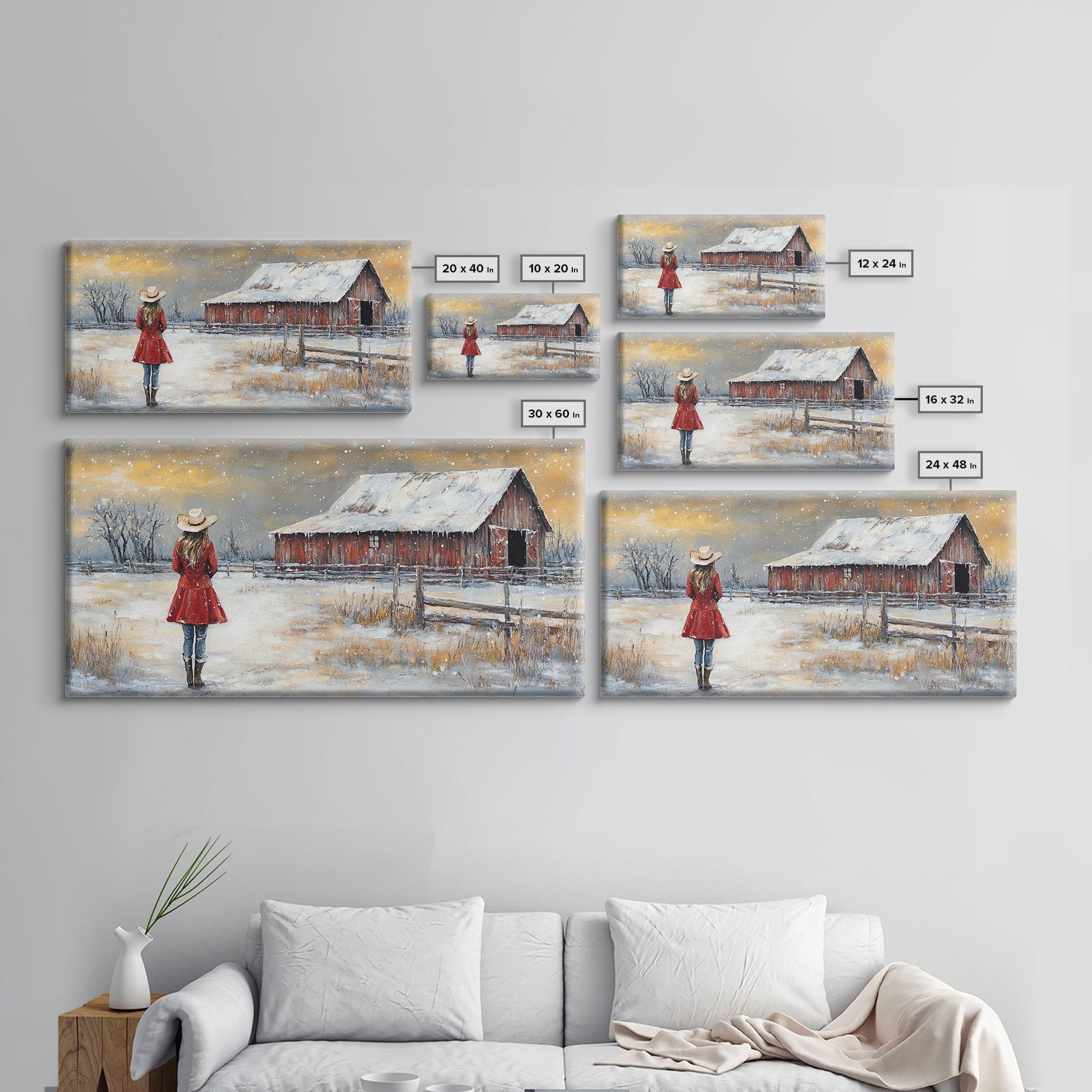Barn Painting Framed Canvas Print, Cowgirl and her Barn, Rustic Farmhouse Decor, Winter Painting, Winter Wonderland, Farmhouse Wall Art