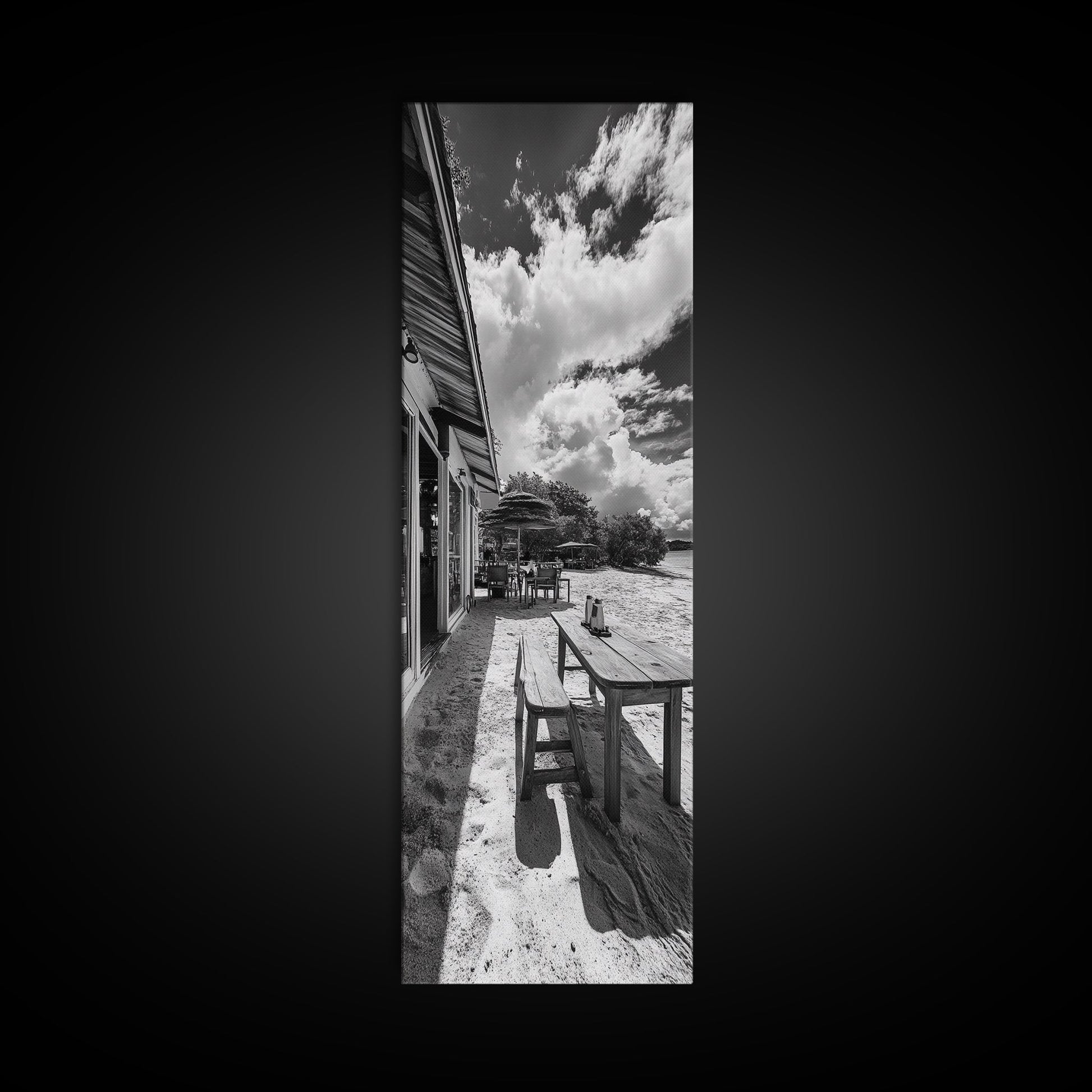 Beach Café Table, Seaside Dining, Rustic Seating, Tropical Getaway, Framed Canvas Print, Kitchen Wall Art, Coastal Rustic Aesthetic