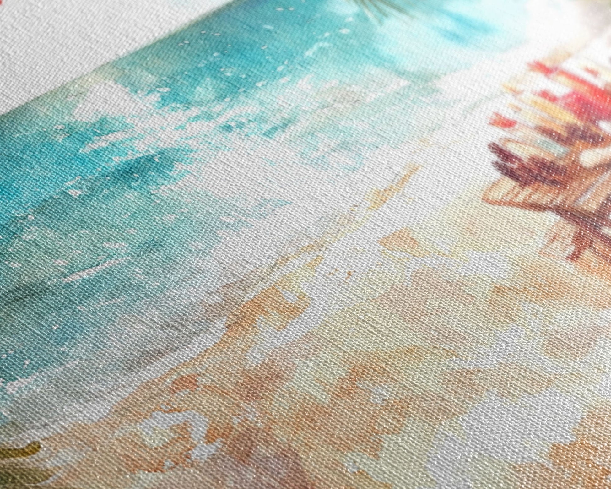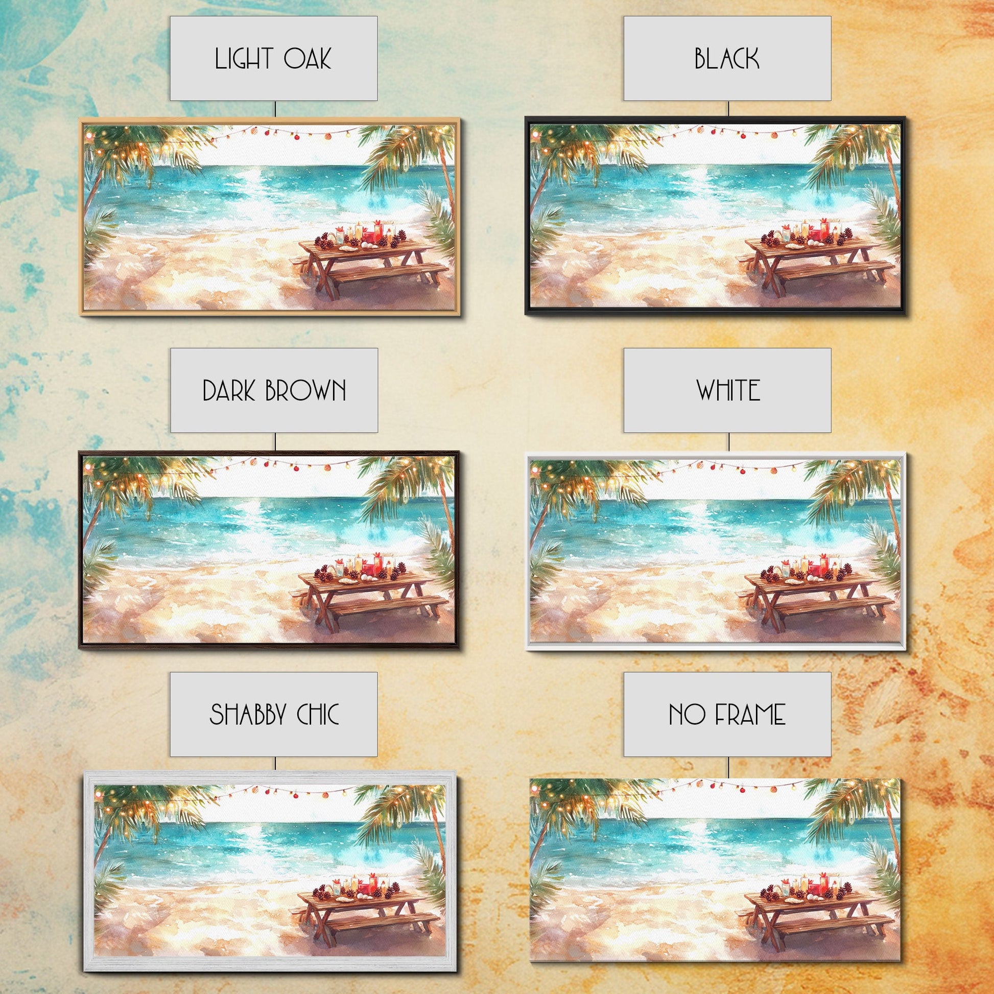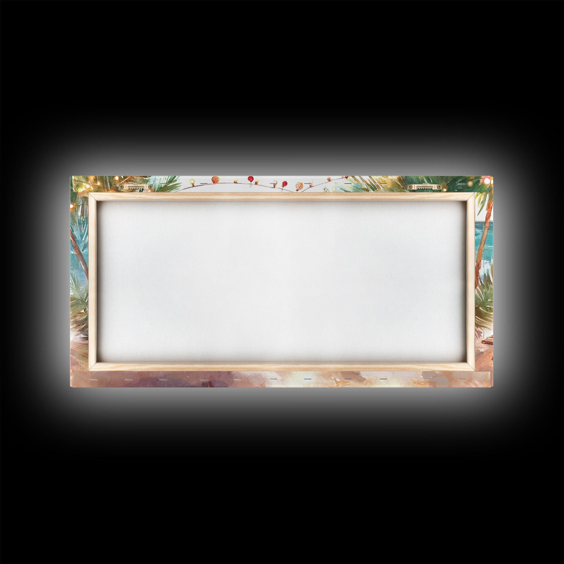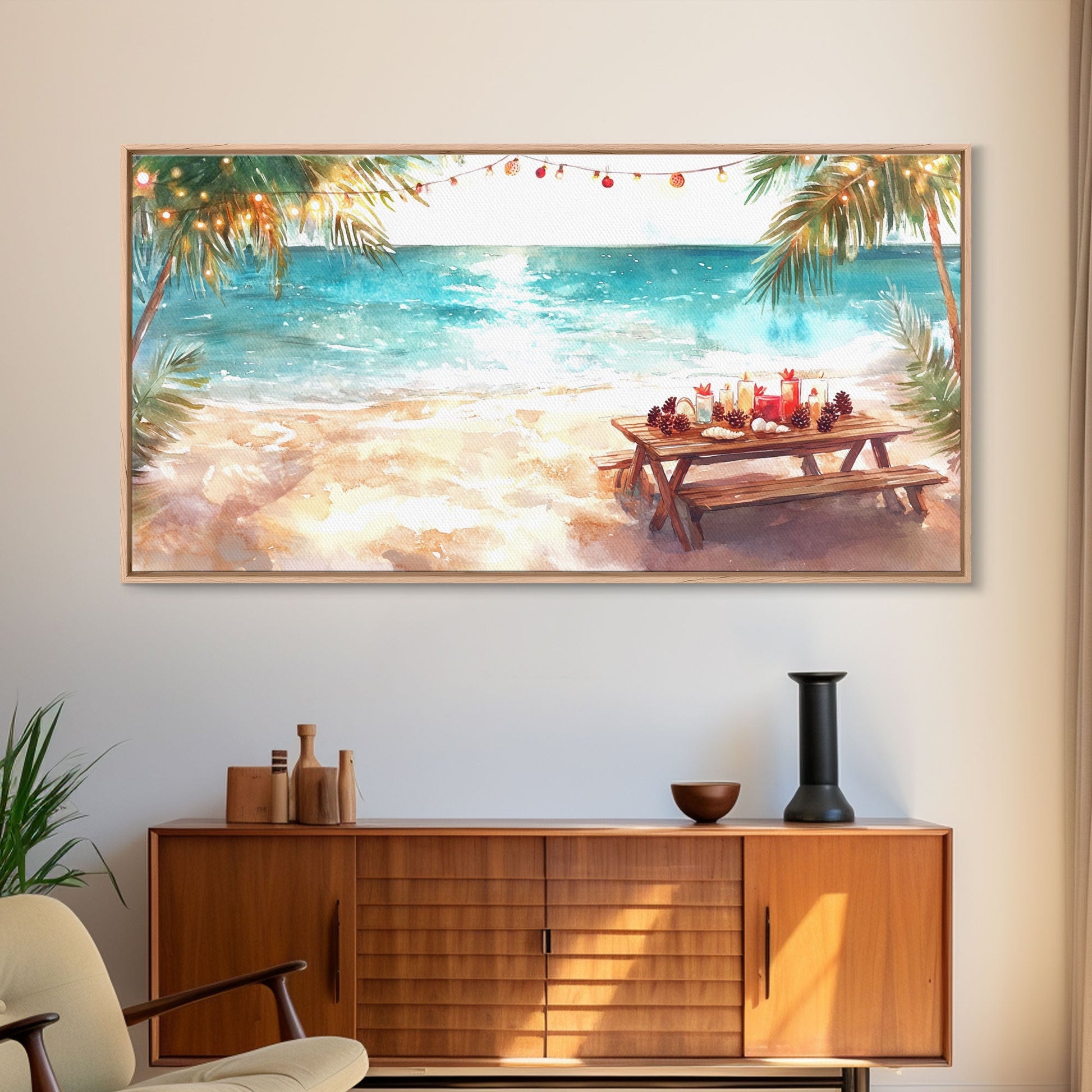 Beach Christmas decor picnic setup with palm trees and lights, framed canvas print showcasing tropical coastal holiday art decor