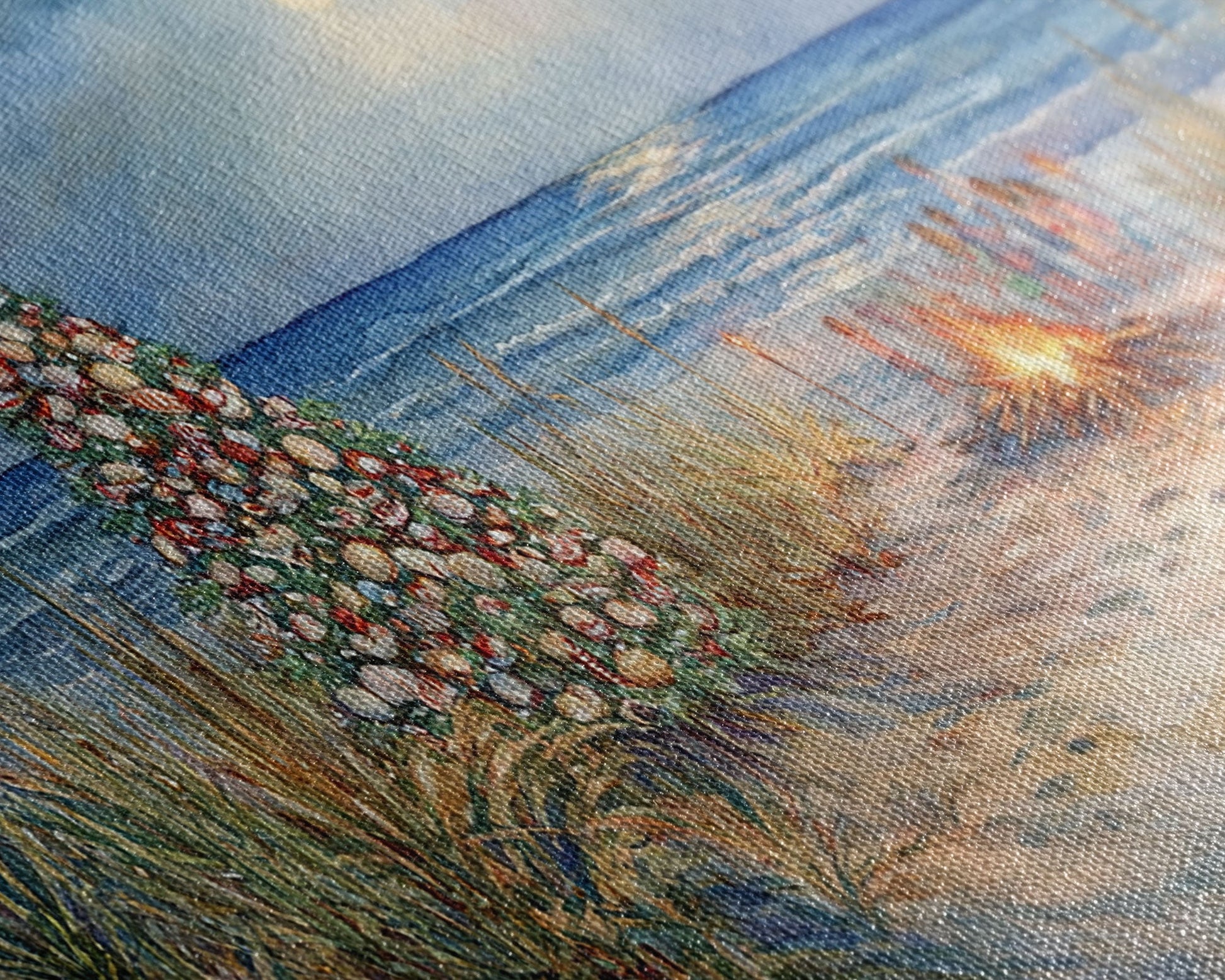 Most of our canvases are made in the USA, with the exception of canvases ordered with the light oak unstained frames, and any large canvases (24x48, 30x60, 16x48 and 20x60) ordered WITH a frame. These are temporarily made in and shipped from Europe, while we try to find a more consistent supplier in the USA.