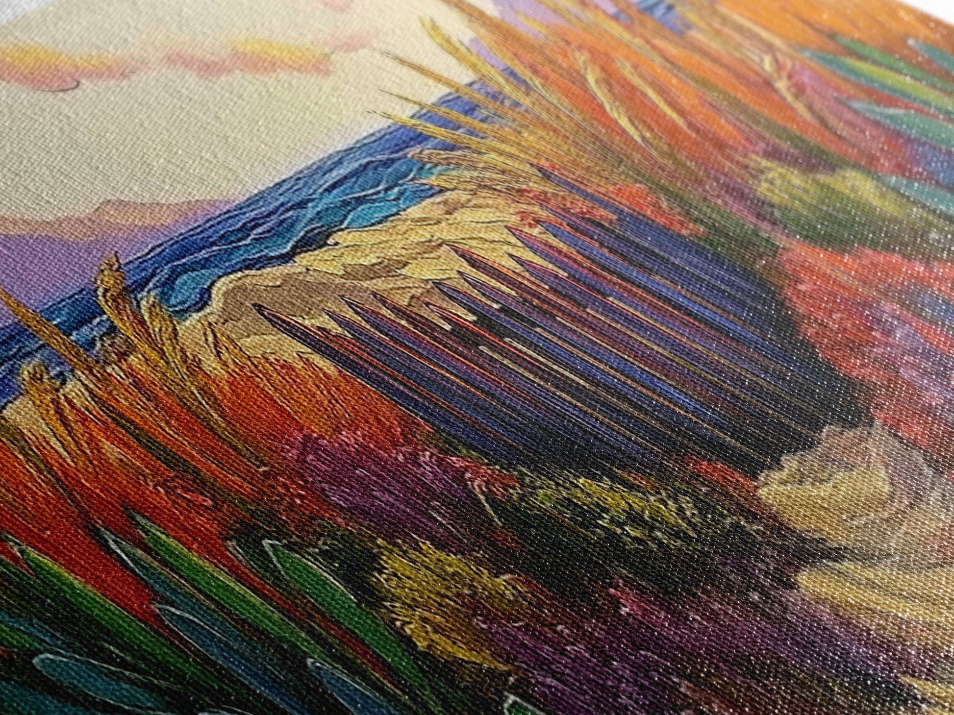 Most of our canvases are made in the USA, with the exception of canvases ordered with the light oak unstained frames, and any large canvases (24x48, 30x60, 16x48 and 20x60) ordered WITH a frame. These are temporarily made in and shipped from Europe, while we try to find a more consistent supplier in the USA.